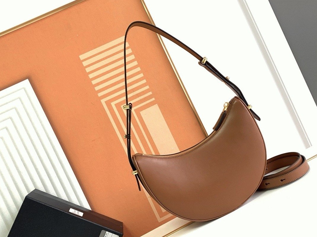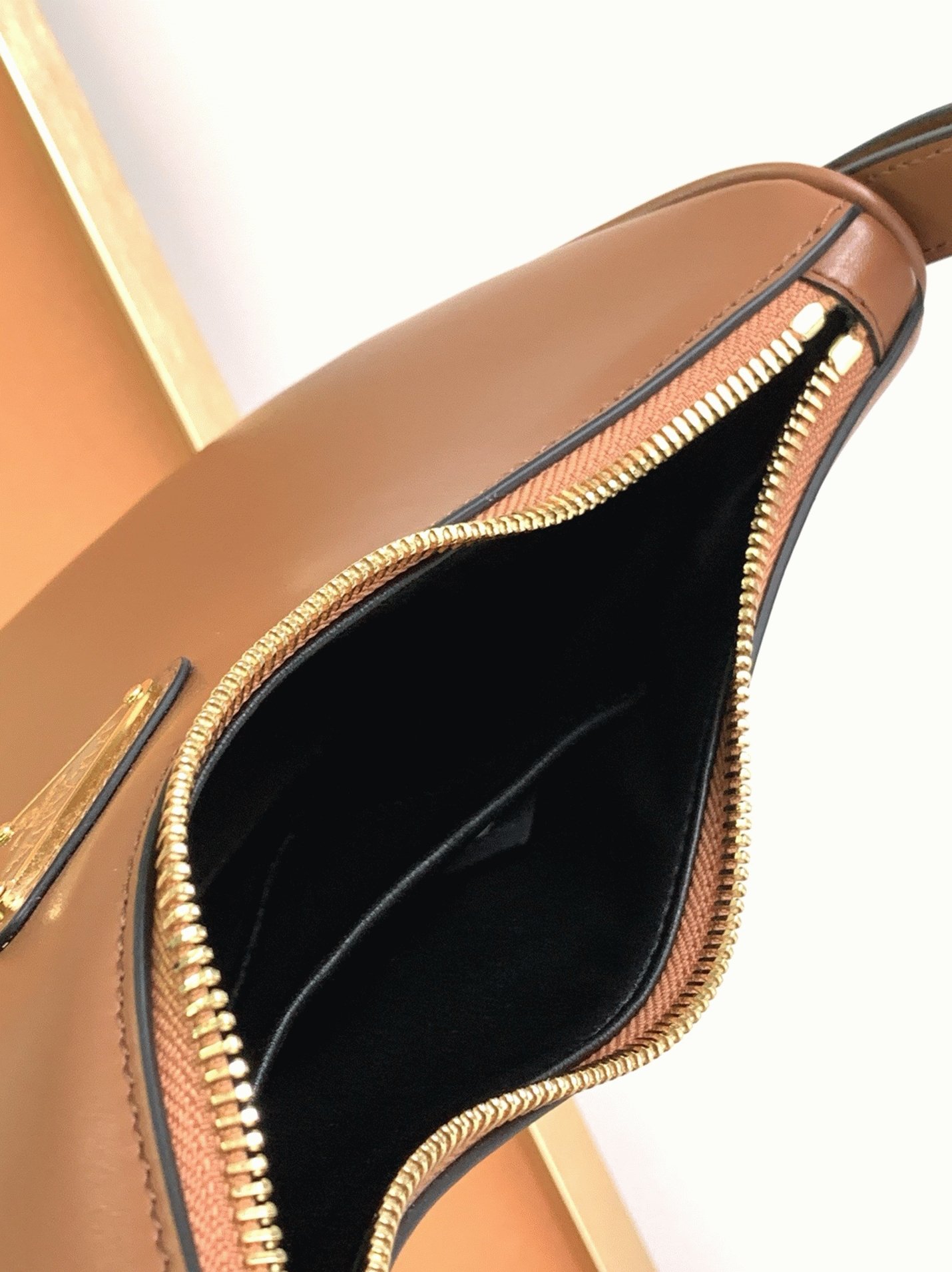 This mini bag highlights sleek, curved contours that give it a contemporary and chic look. Crafted from supple leather, its adorned with refined details and shiny metal hardware. It features the enameled metal triangle logo and an adjustable shoulder strap for versatile styling.