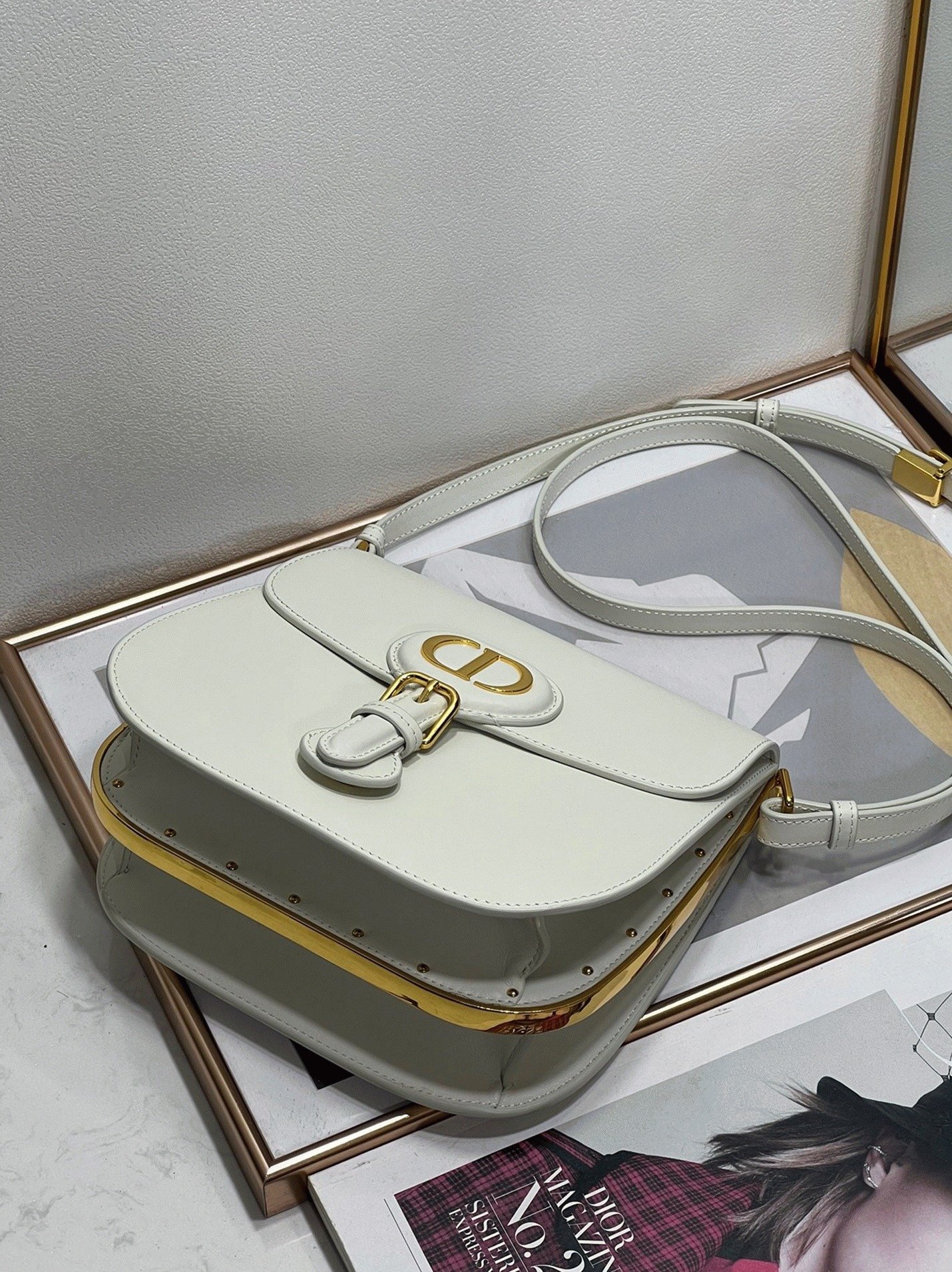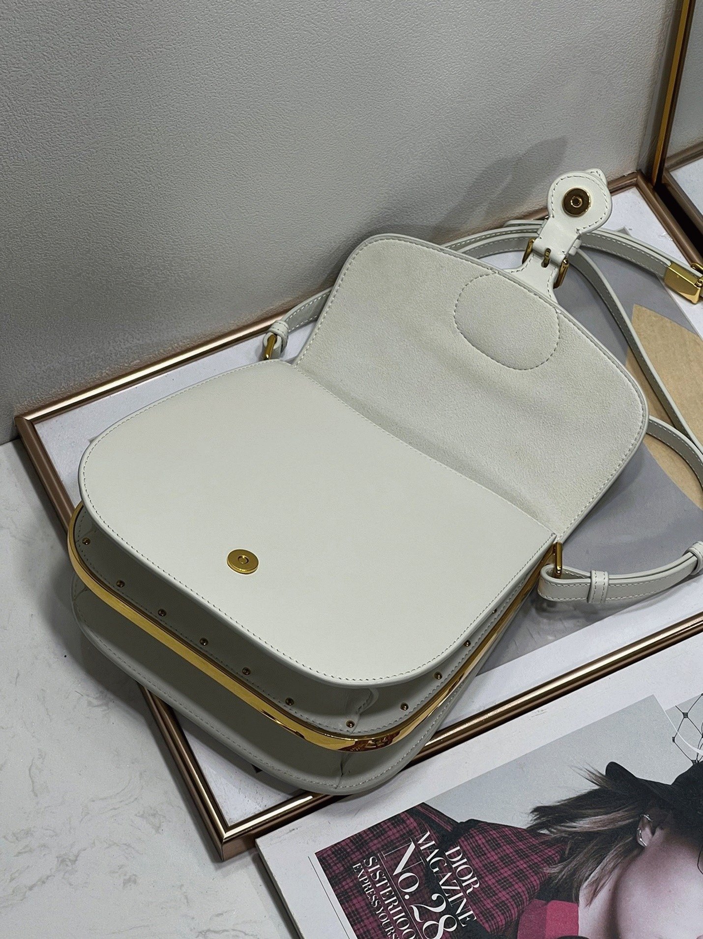 Inspired by a Marc Bohan archival design, the Dior Bobby Frame Bag exudes sophistication with a retro flair. Made from box calfskin, it features a gusseted silhouette, flap closure, and antique gold-finish metal accents. The removable, adjustable sliding shoulder strap includes a military-inspired buckle, providing options to carry by hand, over the shoulder, or crossbody.