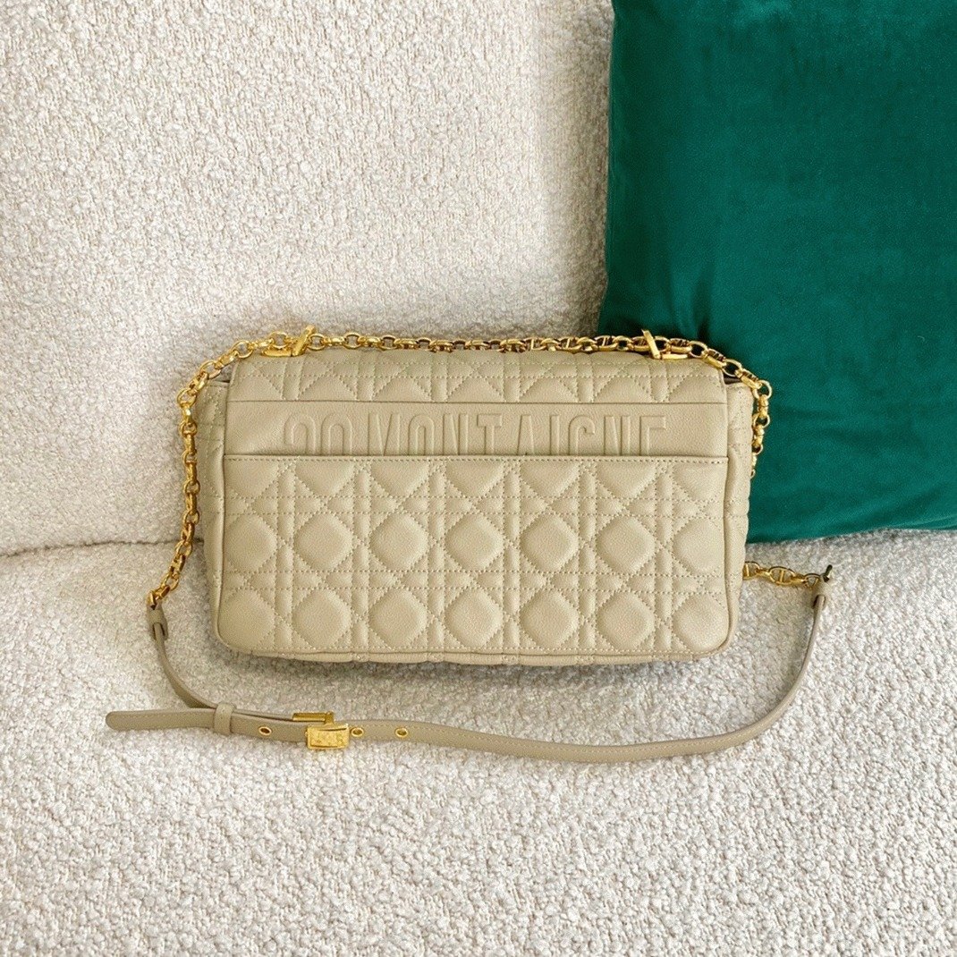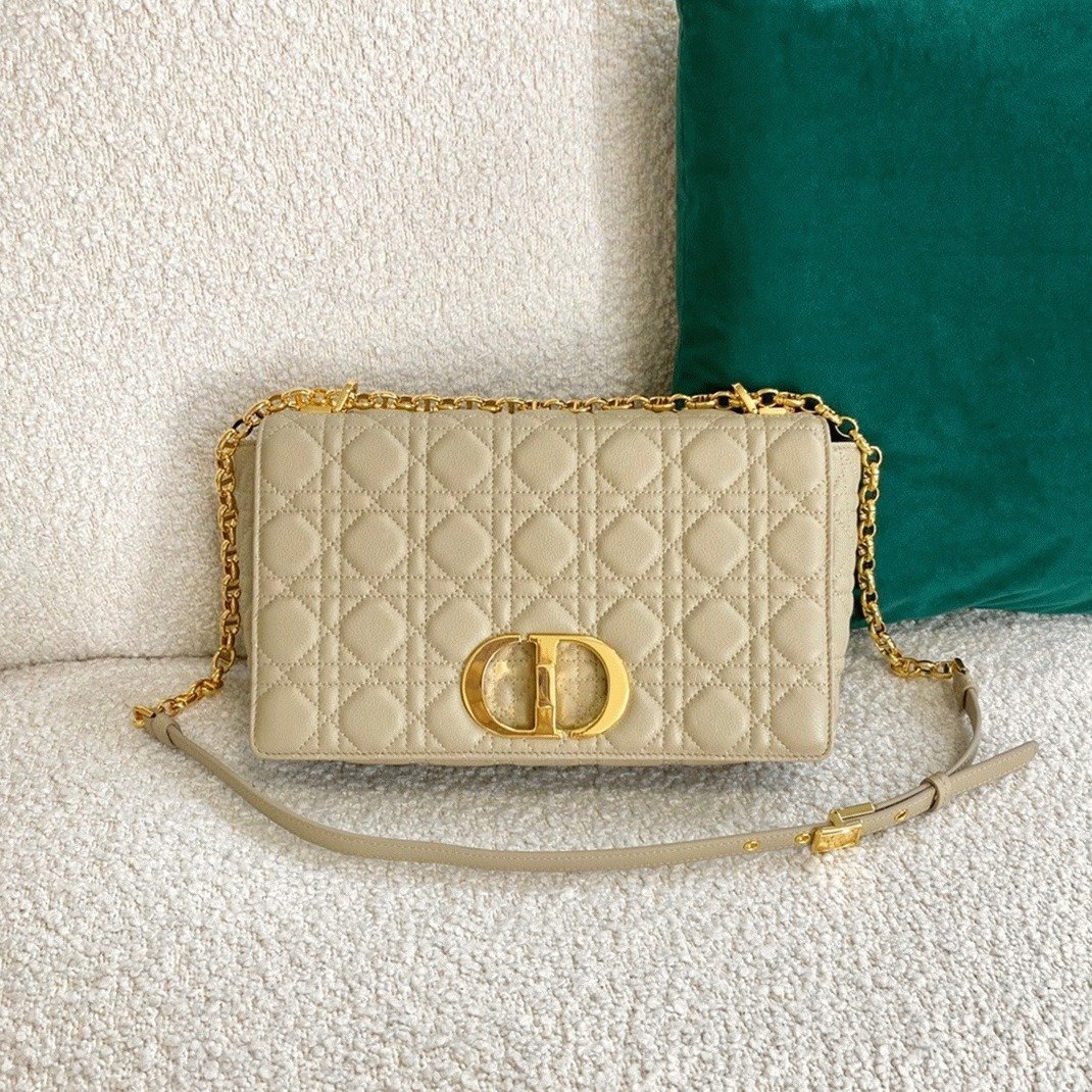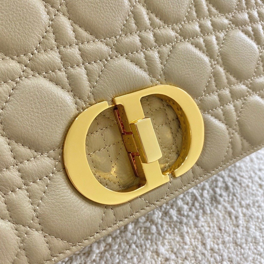 The Dior Caro bag perfectly merges modern flair with timeless sophistication. Made from soft calfskin leather, it features the signature Cannage stitching throughout. Its flap is secured by an antique gold-finished metal ‘CD’ twist clasp, inspired by the seal on Christian Dior perfume bottles. The bag includes a detachable chain shoulder strap with ‘CD’ signature links, allowing it to be carried by hand, over the shoulder, or worn crossbody. For added versatility, this strap can be replaced with one of Diors wide embroidered straps, making the bag ideal for both day and evening looks.