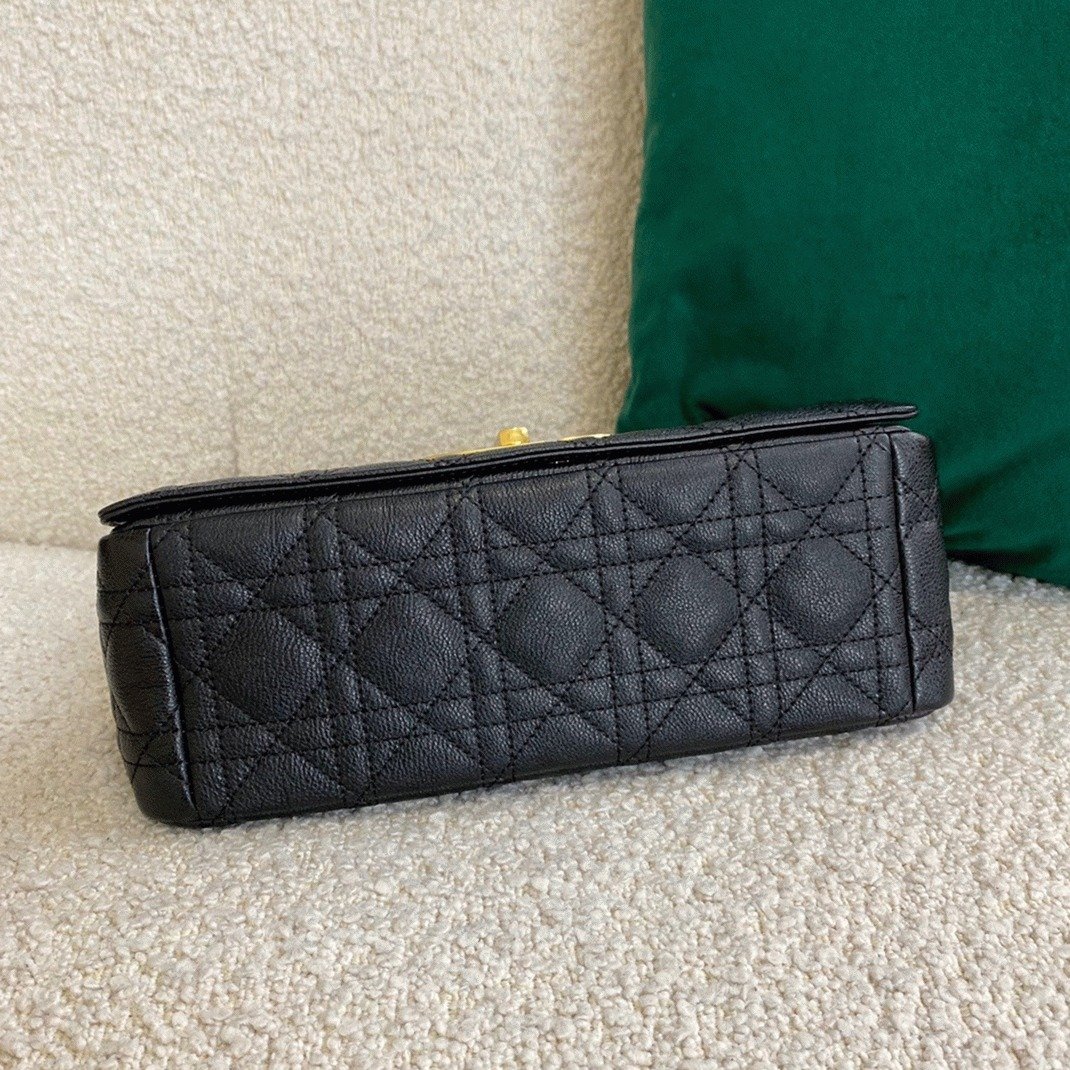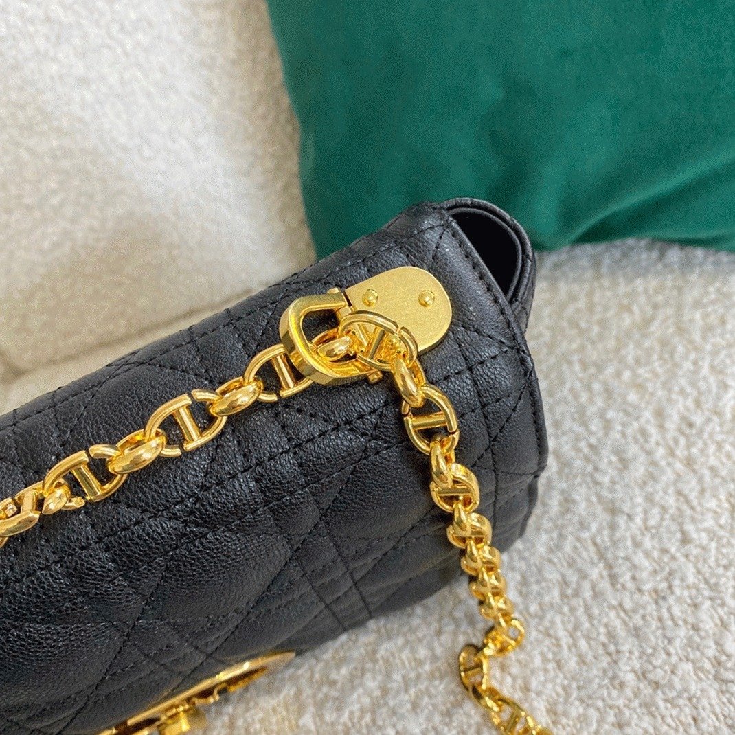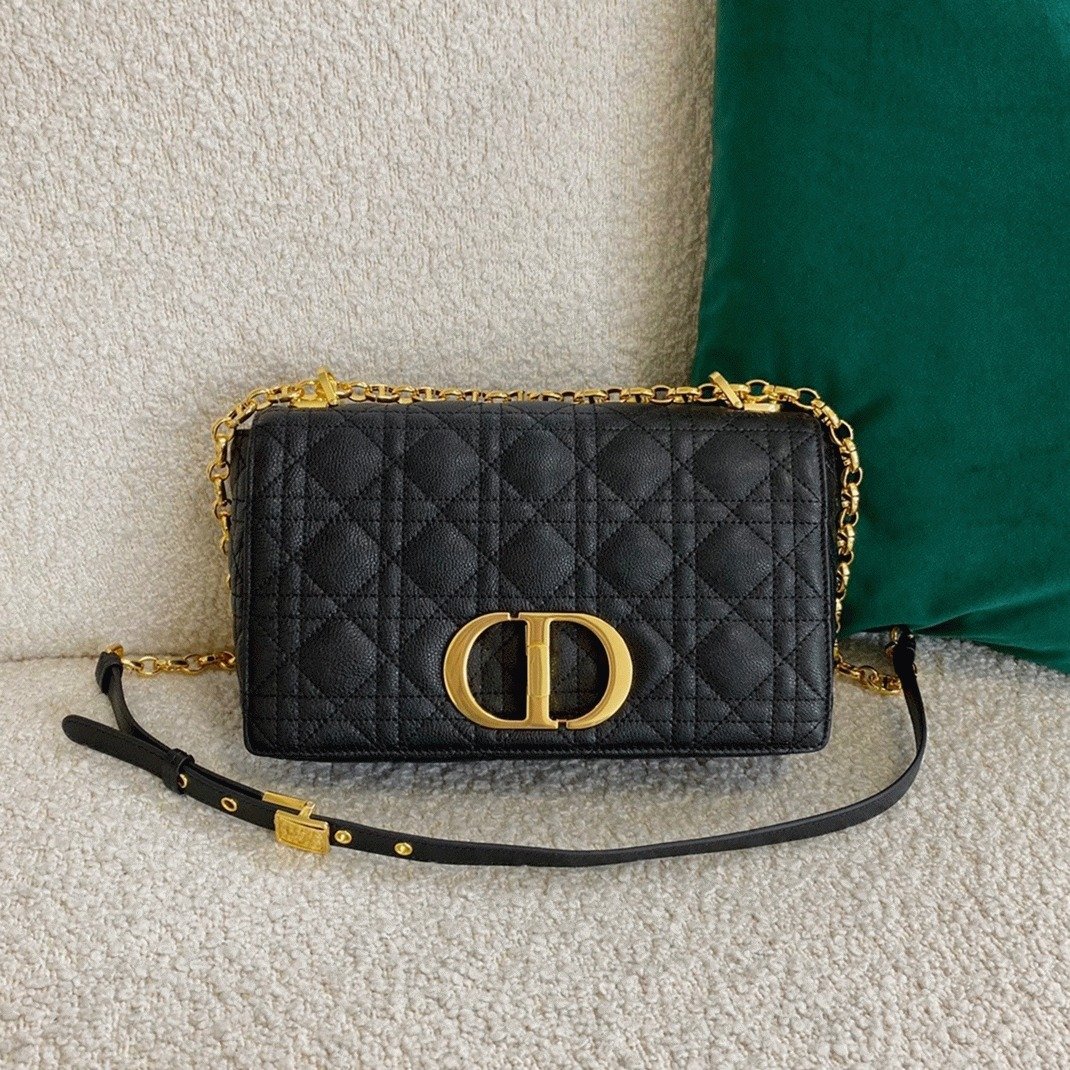 The Dior Caro bag perfectly merges modern flair with timeless sophistication. Made from soft calfskin leather, it features the signature Cannage stitching throughout. Its flap is secured by an antique gold-finished metal ‘CD’ twist clasp, inspired by the seal on Christian Dior perfume bottles. The bag includes a detachable chain shoulder strap with ‘CD’ signature links, allowing it to be carried by hand, over the shoulder, or worn crossbody. For added versatility, this strap can be replaced with one of Diors wide embroidered straps, making the bag ideal for both day and evening looks.