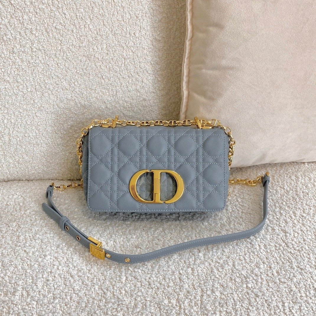 The Dior Caro bag seamlessly combines modern design with timeless elegance. Made from soft calfskin leather, it features the brands signature Cannage stitching. The flap is secured by an antique gold-tone metal ‘CD’ twist clasp, inspired by the seal on Christian Dior perfume bottles. The detachable chain shoulder strap, adorned with ‘CD’ signature links, allows for versatile wearby hand, over the shoulder, or crossbody. This chain can also be replaced with one of Diors wide embroidered straps, making the bag perfect for both day and night occasions.