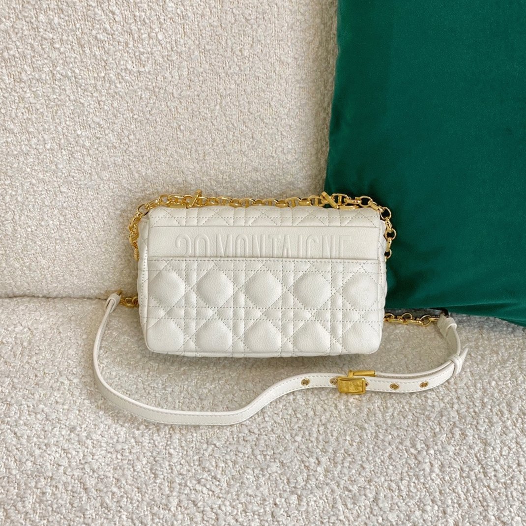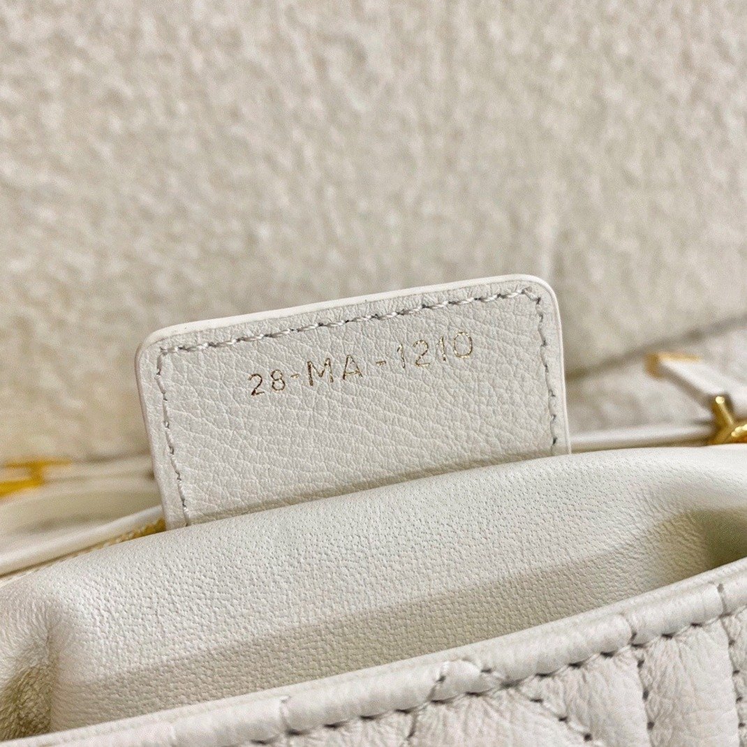 The Dior Caro bag seamlessly combines modern design with timeless elegance. Made from soft calfskin leather, it features the brands signature Cannage stitching. The flap is secured by an antique gold-tone metal ‘CD’ twist clasp, inspired by the seal on Christian Dior perfume bottles. The detachable chain shoulder strap, adorned with ‘CD’ signature links, allows for versatile wearby hand, over the shoulder, or crossbody. This chain can also be replaced with one of Diors wide embroidered straps, making the bag perfect for both day and night occasions.