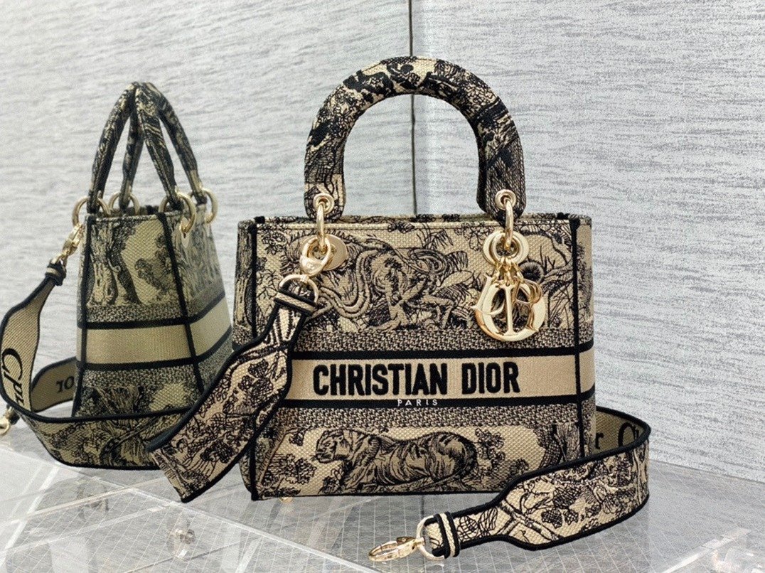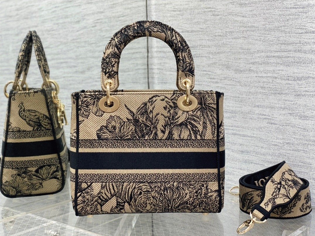 The Lady D-Lite bag captures the Maisons signature grace and sophistication. This elegant piece is meticulously embroidered with Pietro Ruffos beige multicolor Toile de Jouy Voyage motif, setting Monsieur Diors iconic pattern amid lush Indian botanicals. Pale gold-tone metal D.I.O.R. charms highlight and complement the structured silhouette. Designed for versatility, the medium-sized bag includes a wide embroidered strap that allows it to be worn crossbody or carried by hand.