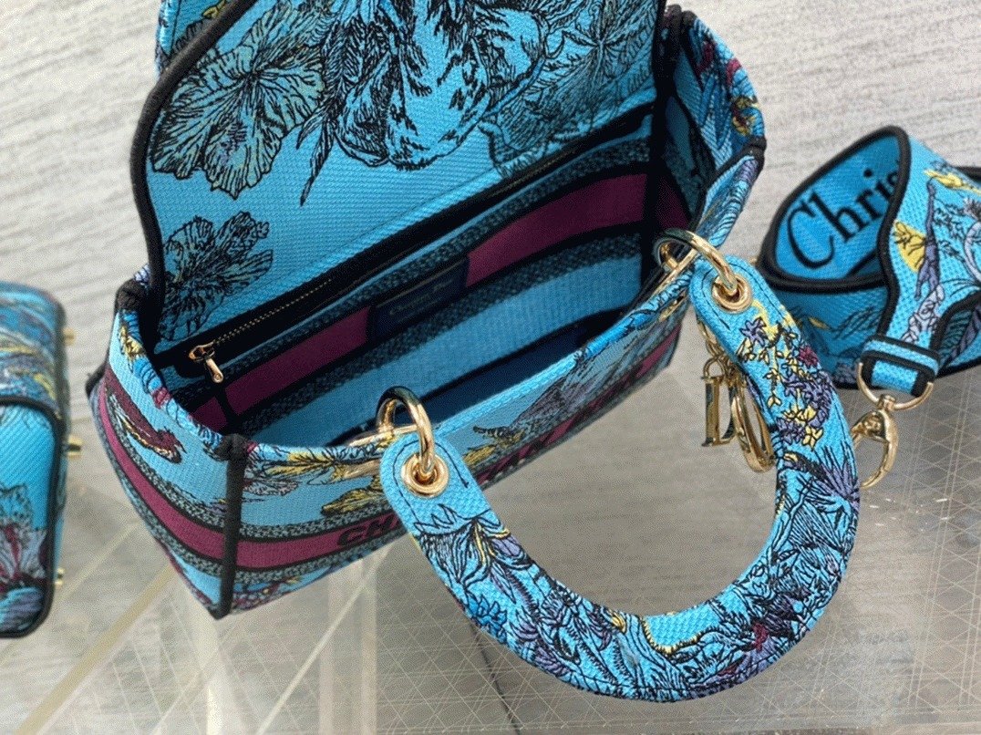 The Lady D-Lite Bag is a celebration of timeless beauty and House artistry. Entirely embroidered with Pietro Ruffos vibrant Toile de Jouy Voyage design, the multicolor pattern infuses Monsieur Diors legacy with exotic Indian flora. Pale gold ‘D.I.O.R.’ charms adorn the silhouette, while the removable, reversible shoulder strap offers styling flexibilitywear it crossbody or carry it by hand.