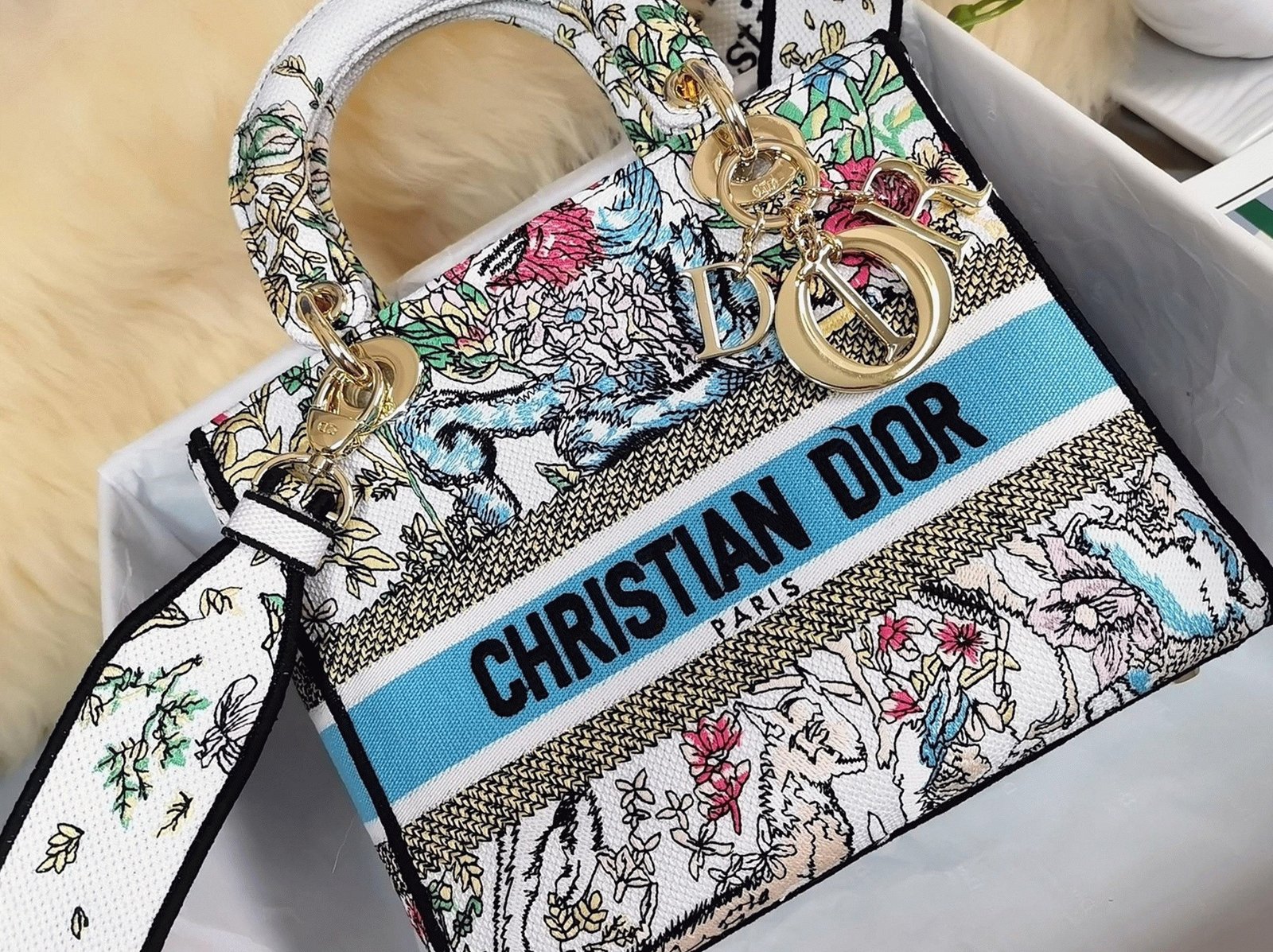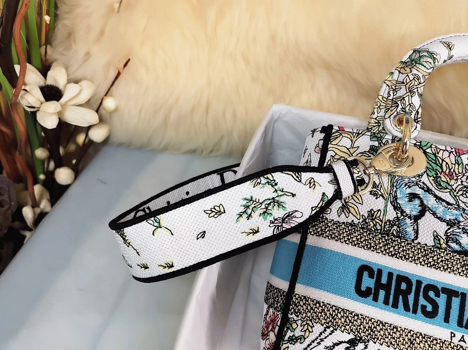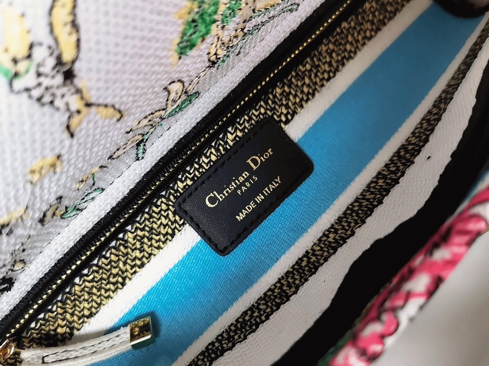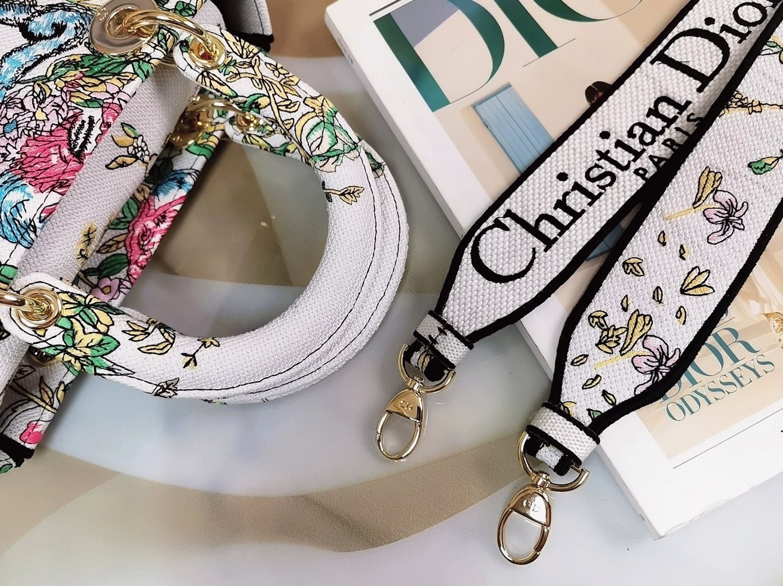 Designed for flexible styling, the medium Lady D-Lite includes a wide embroidered strap that is both removable and reversible, allowing for hand, shoulder, or crossbody carry. Inside, the bag features a zip pocket and a large patch pocket for practical organization. It can also be customized with other embroidered straps for a personalized look.