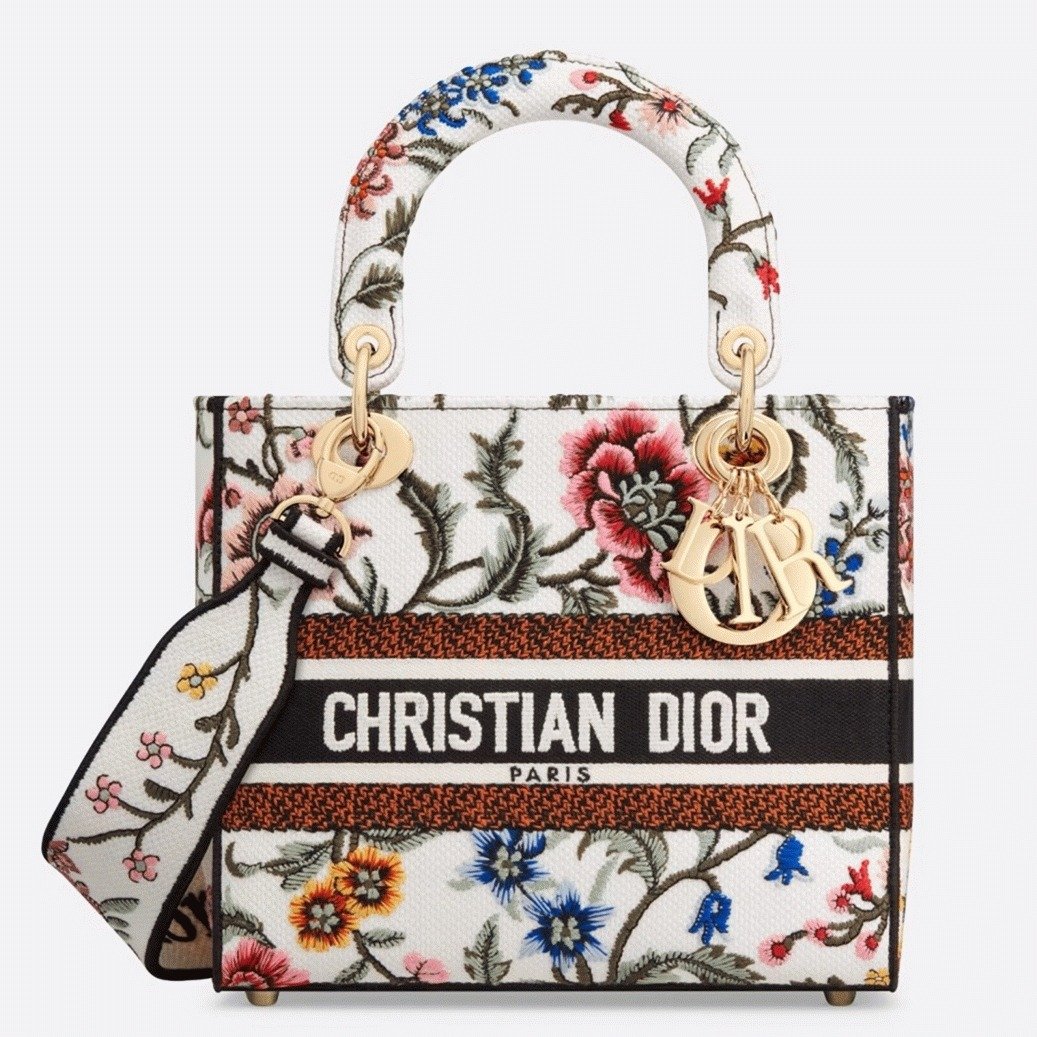 The Lady D-Lite bag merges classic style with a vibrant, modern spirit. This version is fully embroidered with the multicolor Dior Petites Fleurs motif, celebrating Diors floral heritage with color and elegance. The signature ‘CHRISTIAN DIOR PARIS’ is prominently featured on the front, with pale gold-finish ‘D.I.O.R.’ charms adding a touch of shine.