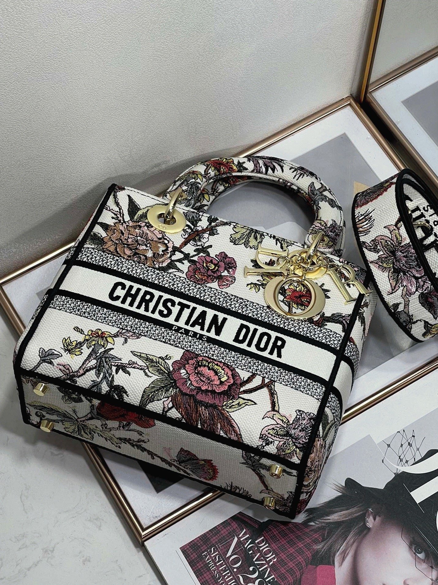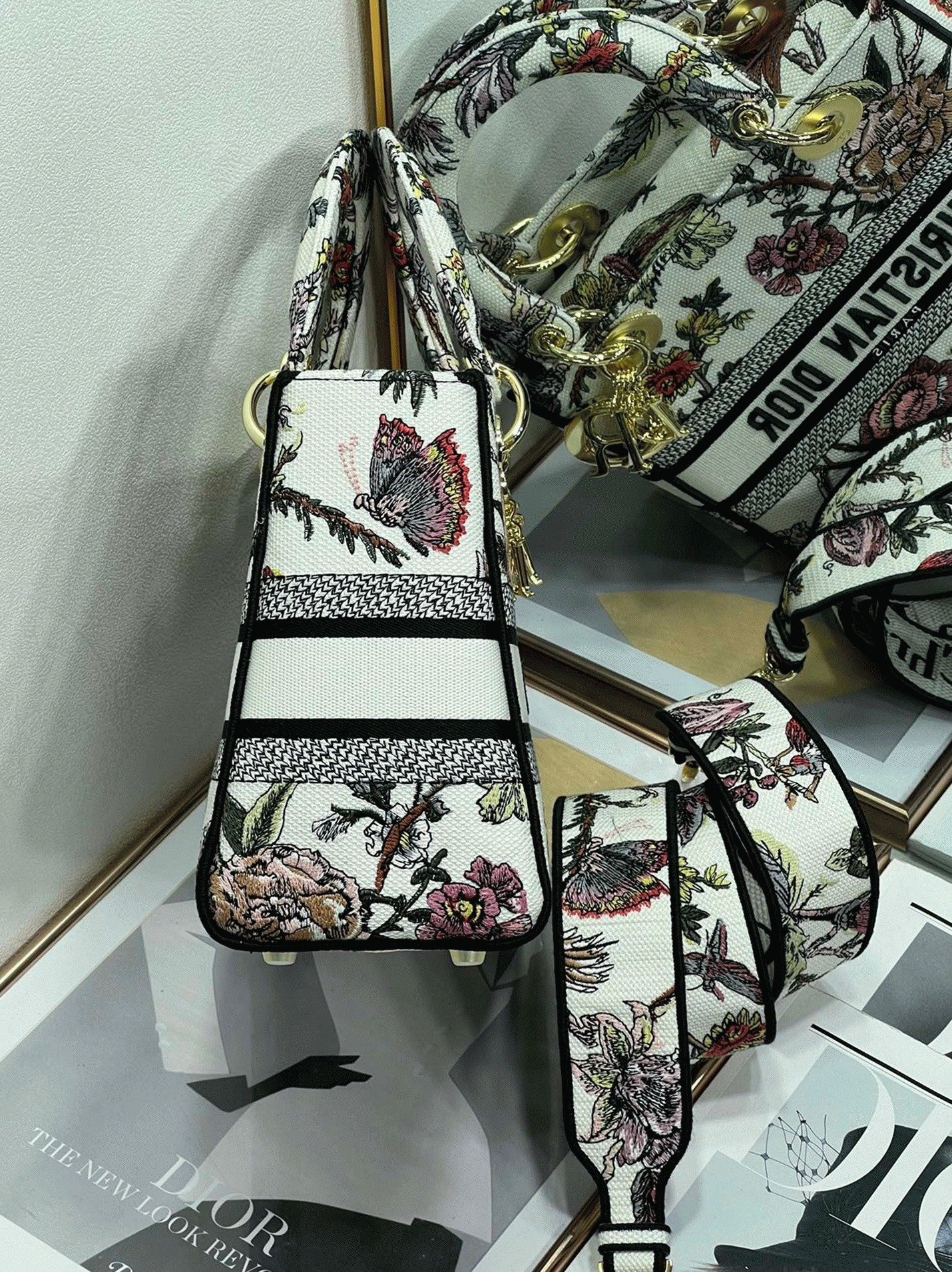 The Lady D-Lite with Jardin Botanique embroidery combines timeless sophistication with contemporary flair, making it a versatile and elegant accessory.