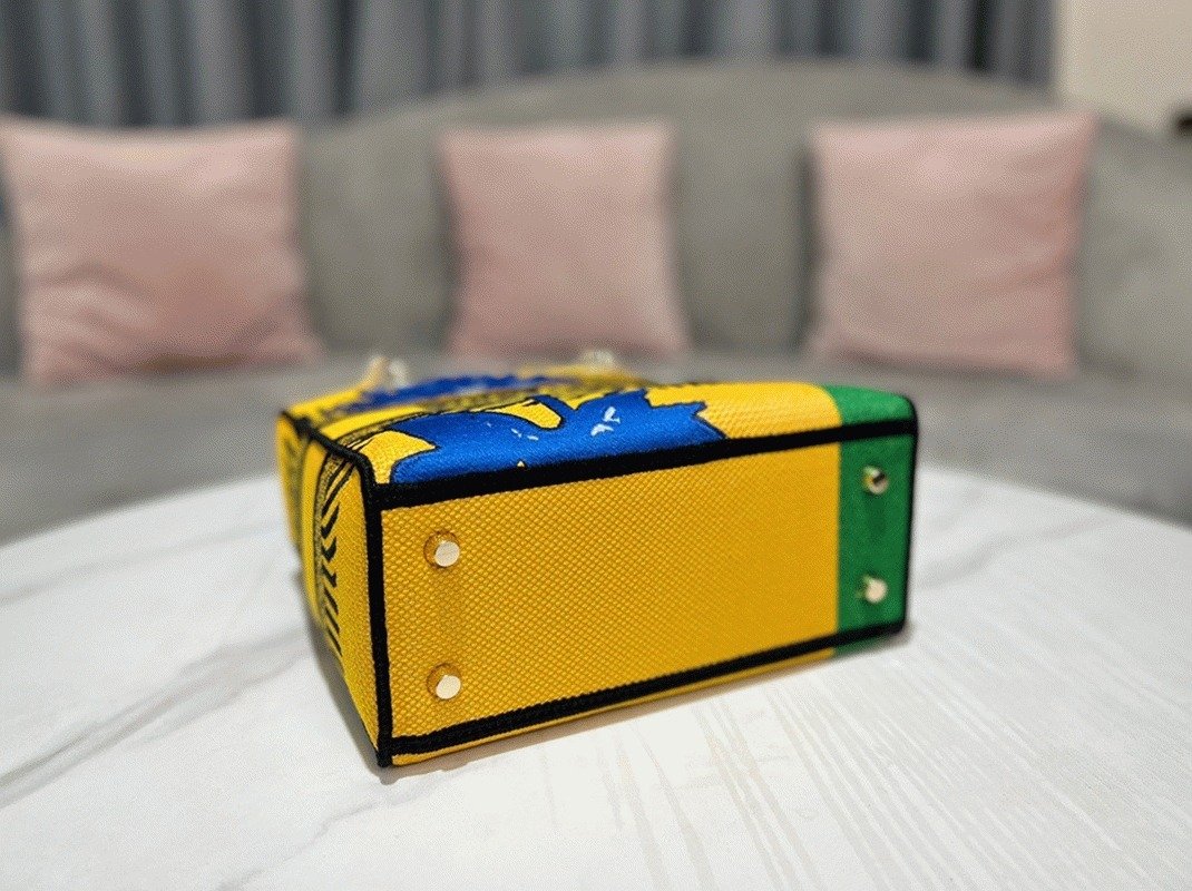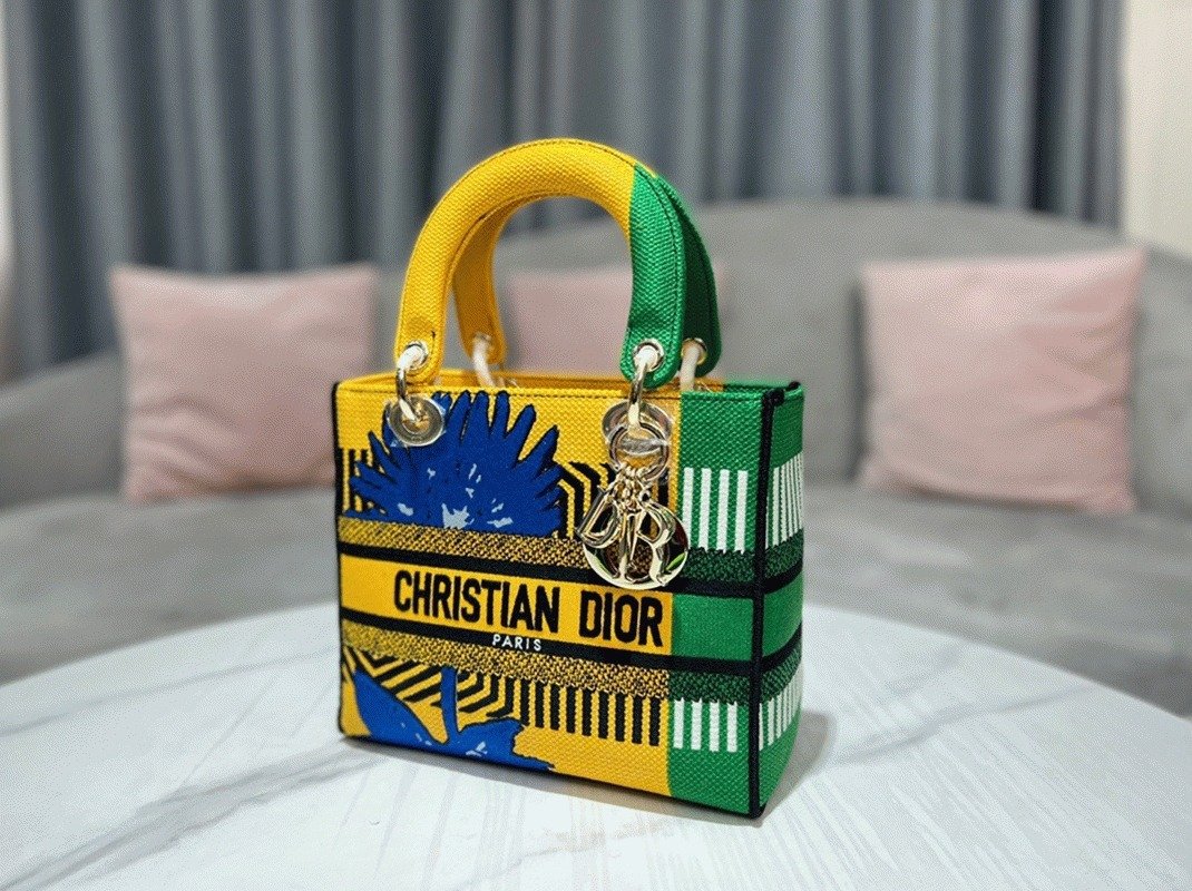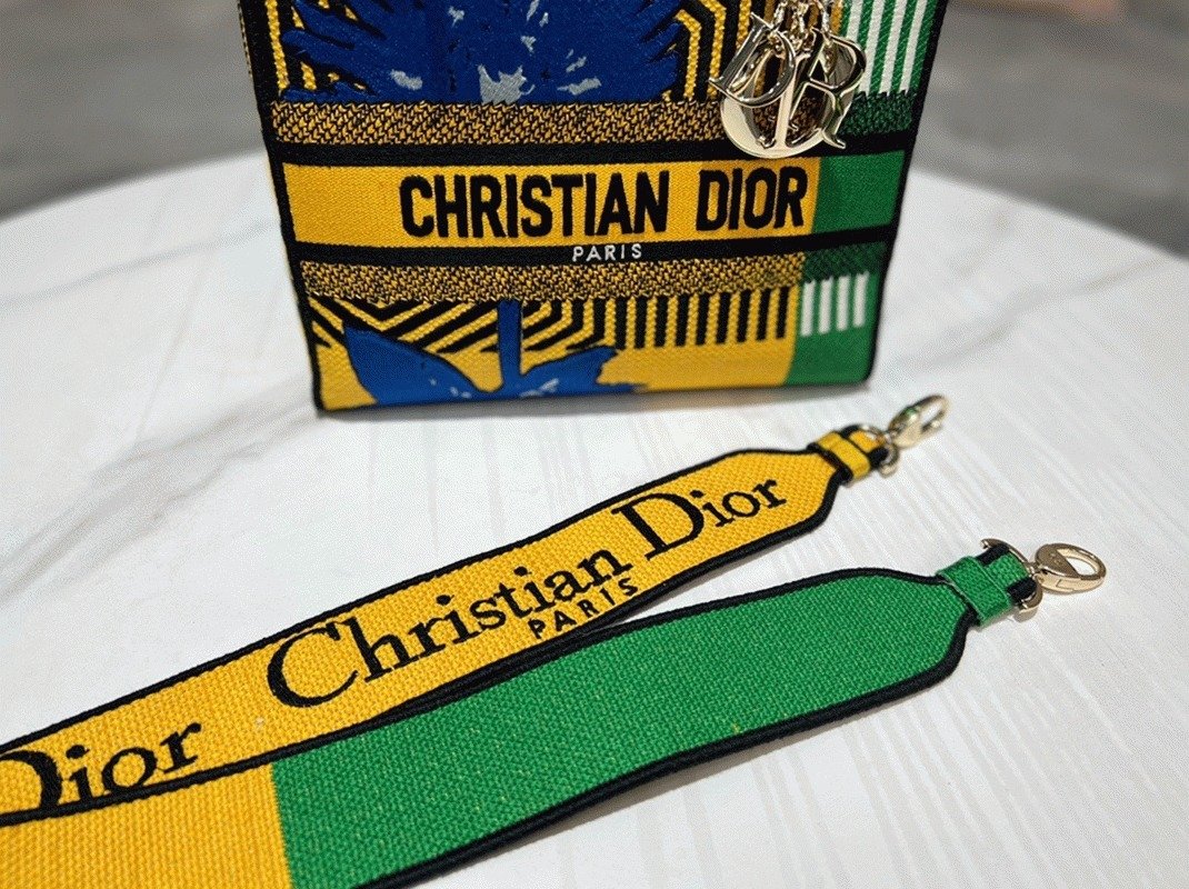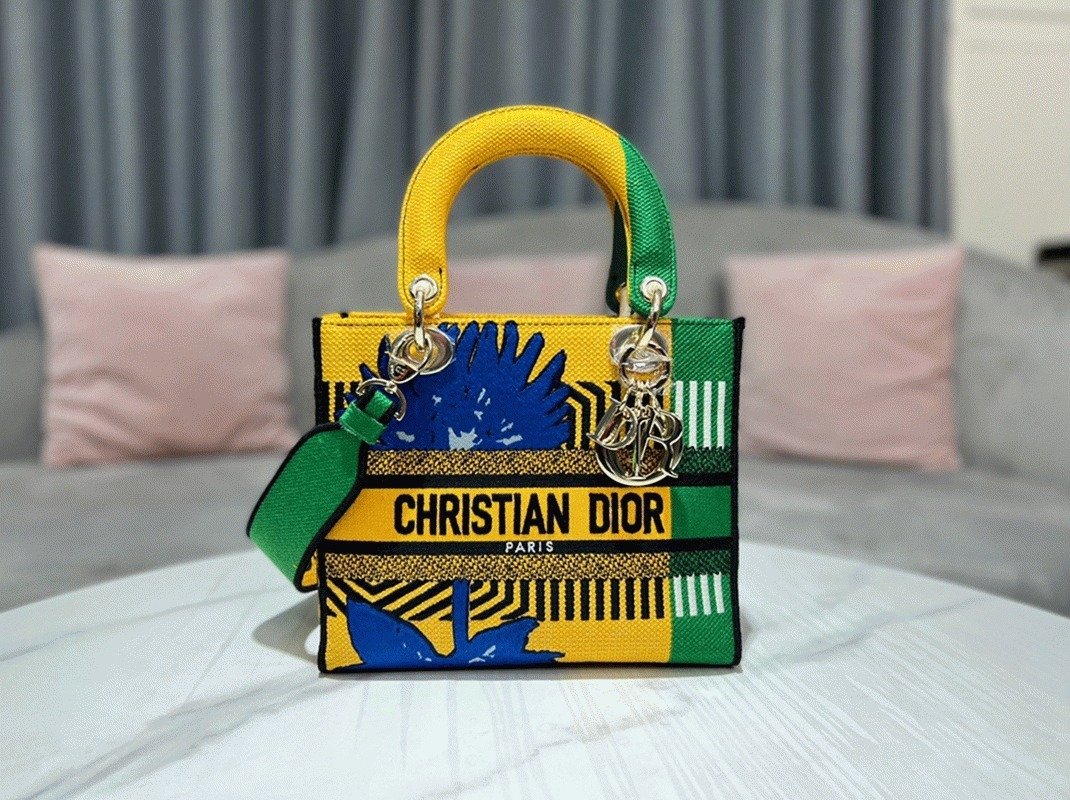 Effortlessly combining classic refinement with Diors contemporary style, the Lady D-Lite bag features the vibrant bright yellow and green D-Flower Pop embroidery motif, representing the colorful essence of the collection. The front is marked with the CHRISTIAN DIOR PARIS signature, complemented by thick pale gold-finish D.I.O.R. charms that add a luxurious highlight.