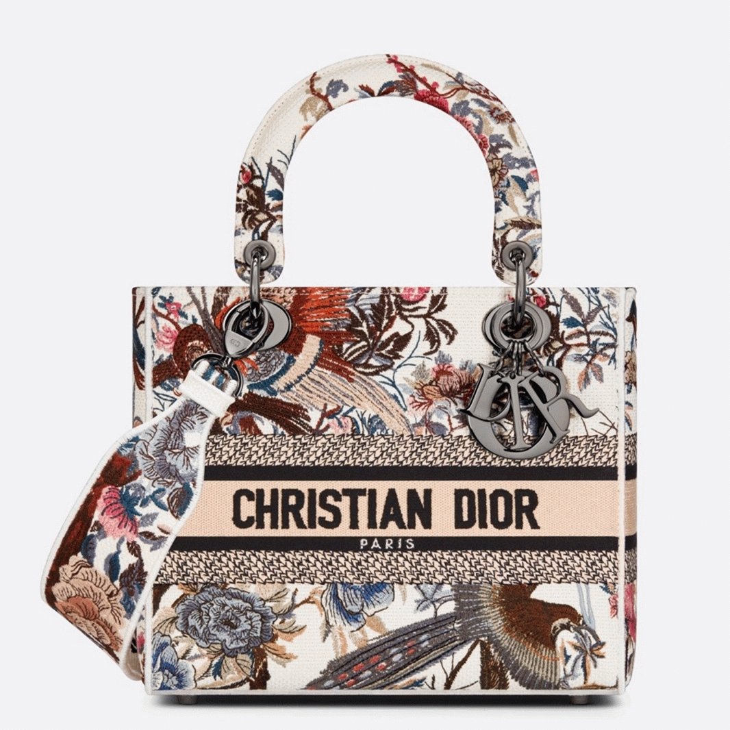 The Lady D-Lite bag captures Diors elegant spirit through modern design. Embroidered in soft tones with the Dior Jardin dHiver motif, it pays tribute to Monsieur Diors love for nature and art. The front carries the iconic ‘CHRISTIAN DIOR PARIS’ emblem, and metallic charms with a ruthenium finish offer a stylish touch. Fitted with a wide embroidered shoulder strap that is both reversible and removable, this medium bag can be hand-carried or worn across the body.