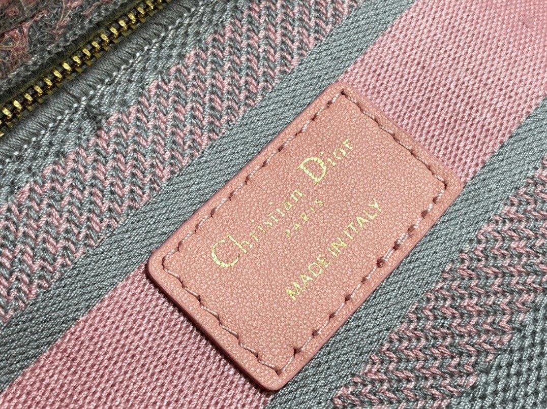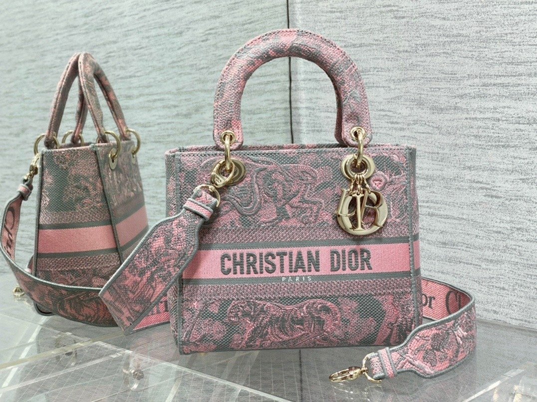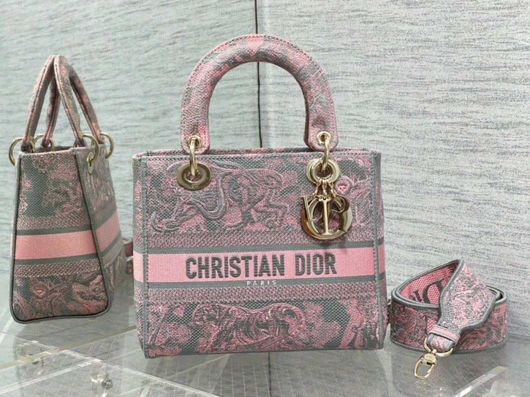 Blending modern charm with classic elegance, the Lady D-Lite Bag is embroidered in gray and pink Toile de Jouy Reversean inventive take on the Houses heritage print that uses inverted hues for a fresh look. The front showcases the ‘Christian Dior Paris’ signature, while polished pale-gold D.I.O.R. charms lend a refined touch. A removable, wide, reversible embroidered strap ensures it transitions seamlessly between crossbody and handheld styles.