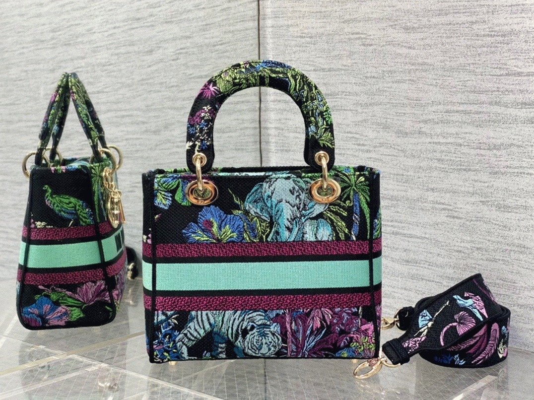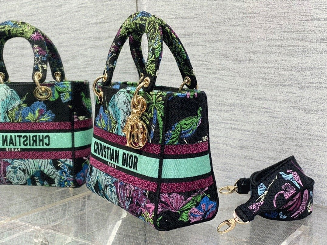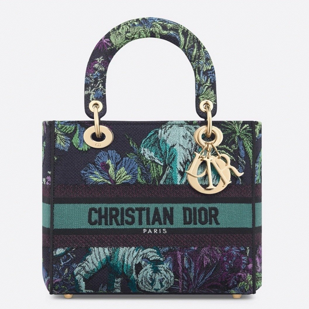 A true symbol of Dior elegance, the Lady D-Lite Bag is reimagined in refined detail. Fully embroidered with Pietro Ruffos blue multicolor Toile de Jouy Voyage pattern, it artfully places Monsieur Diors classic print within a dreamscape of Indian flora and fauna. The pale gold-finish metal D.I.O.R. charms add a luminous accent. This medium version features a wide embroidered strap, ideal for shoulder or crossbody wear, as well as being carried by hand.