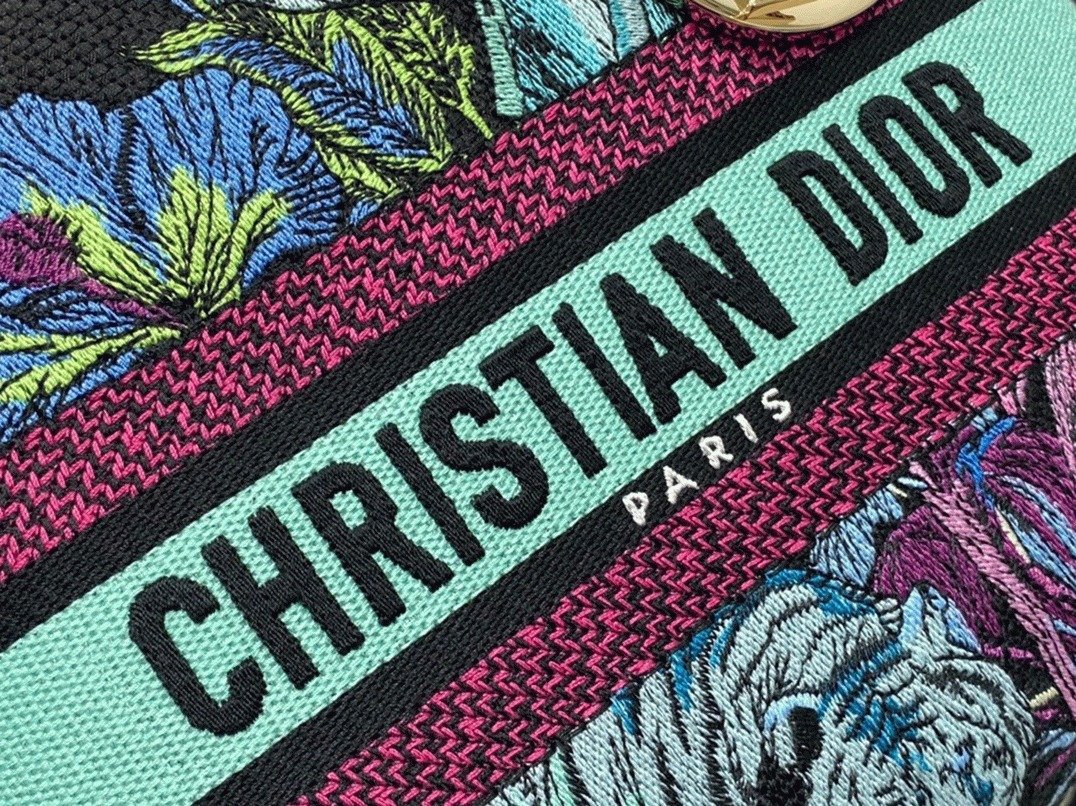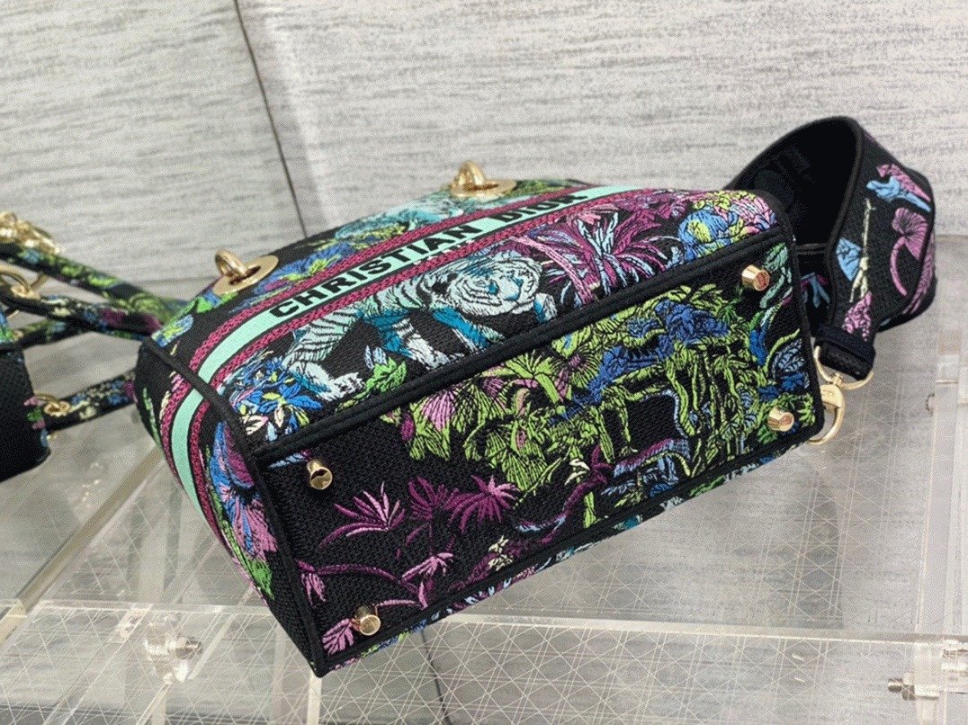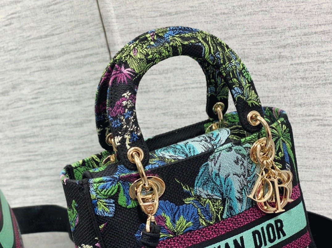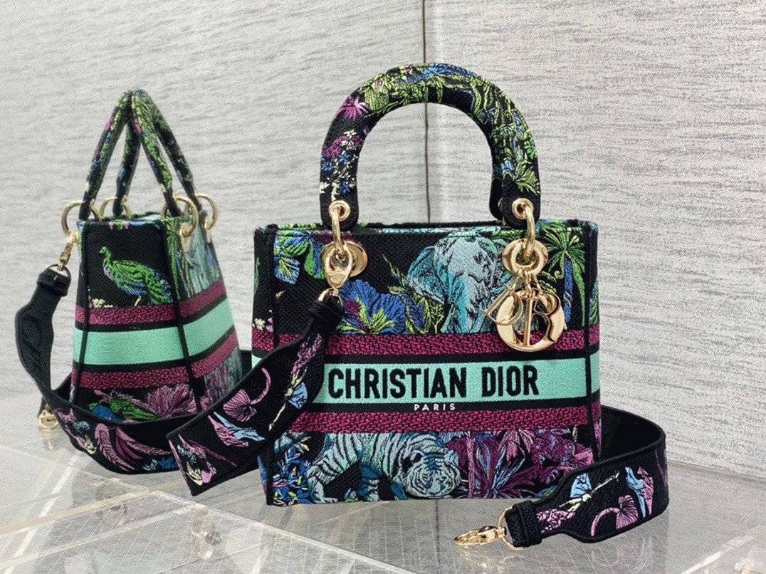 A true symbol of Dior elegance, the Lady D-Lite Bag is reimagined in refined detail. Fully embroidered with Pietro Ruffos blue multicolor Toile de Jouy Voyage pattern, it artfully places Monsieur Diors classic print within a dreamscape of Indian flora and fauna. The pale gold-finish metal D.I.O.R. charms add a luminous accent. This medium version features a wide embroidered strap, ideal for shoulder or crossbody wear, as well as being carried by hand.