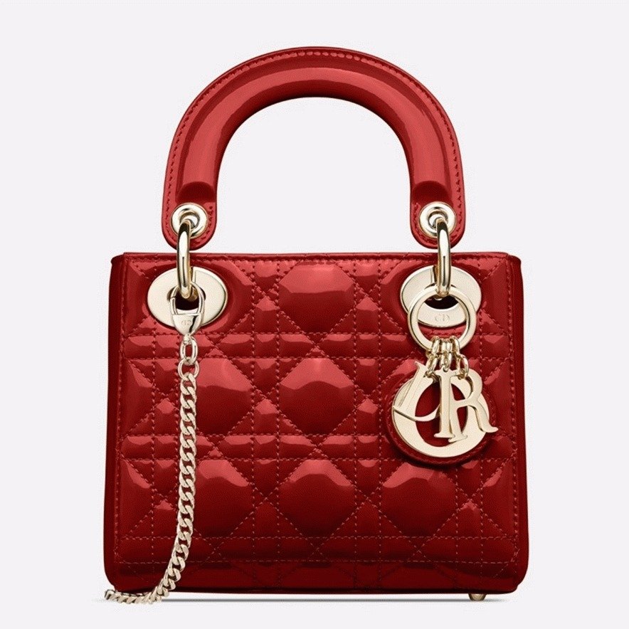 The Lady Dior bag captures the very spirit of the Houses elegance and charm. This classic piece is expertly crafted from patent calfskin featuring the signature Cannage quilting, which gives it a unique textured appearance. Accented with pale gold-tone metal ‘D.I.O.R.’ charms, this mini version of the Lady Dior includes a detachable chain shoulder strap for versatile wearcarry it by hand or wear it crossbody, perfect for evening occasions.