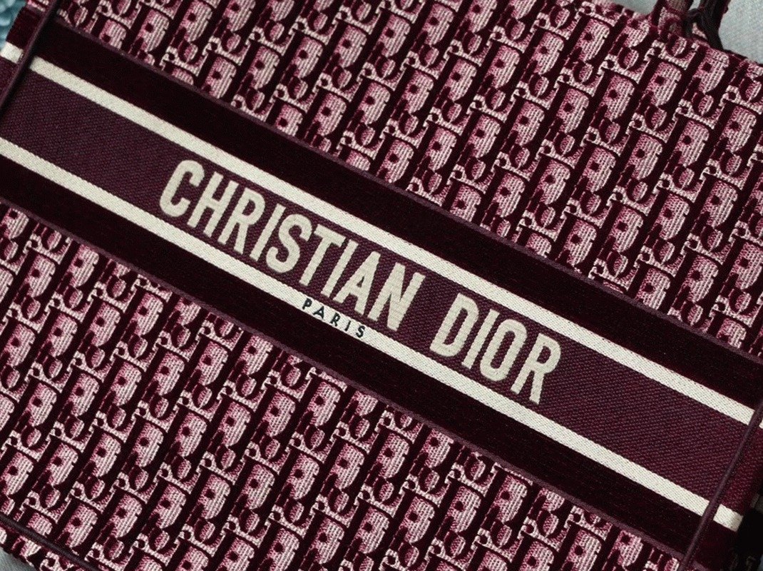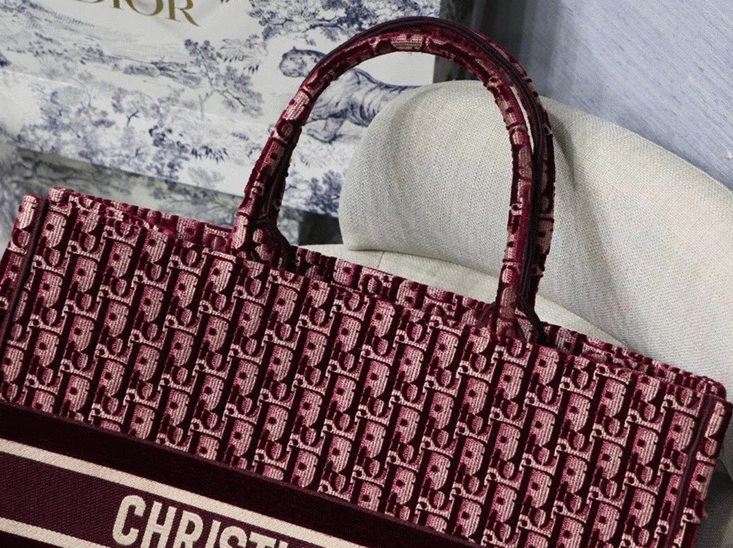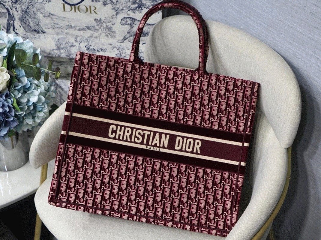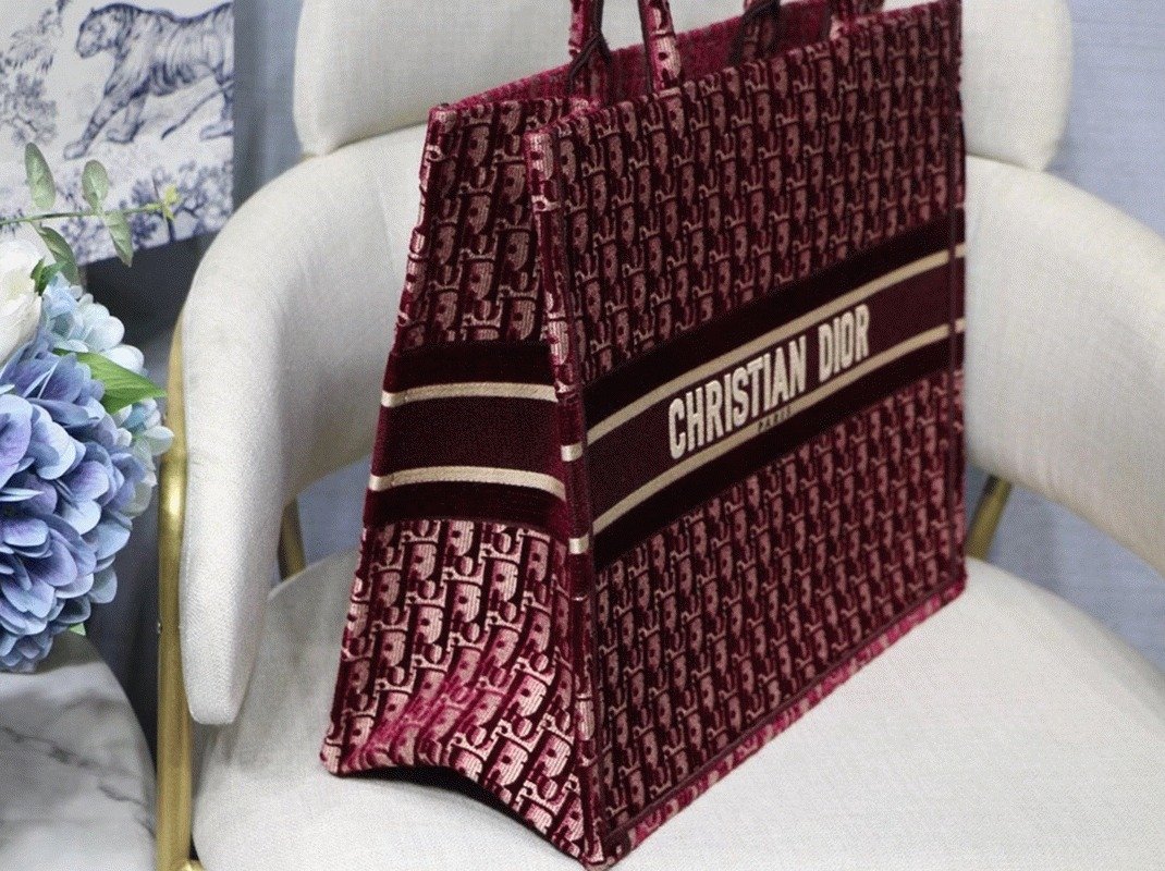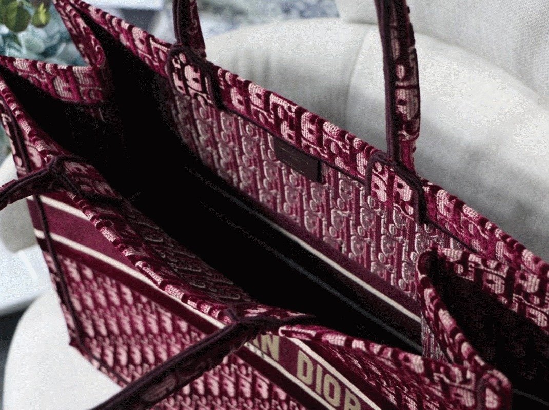 Dior Large Book Tote Bag Fake in Bordeaux Oblique Embroidered Velvet