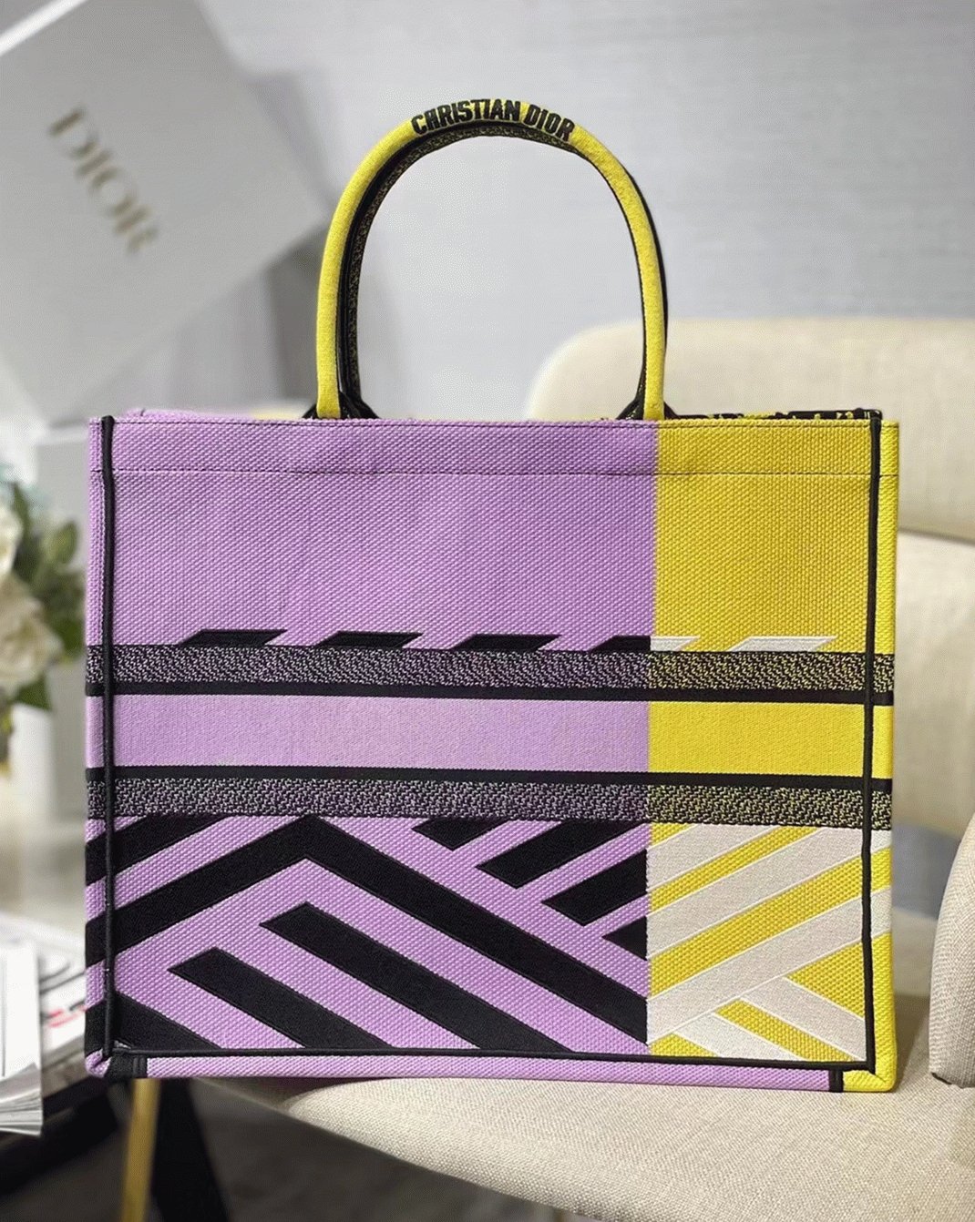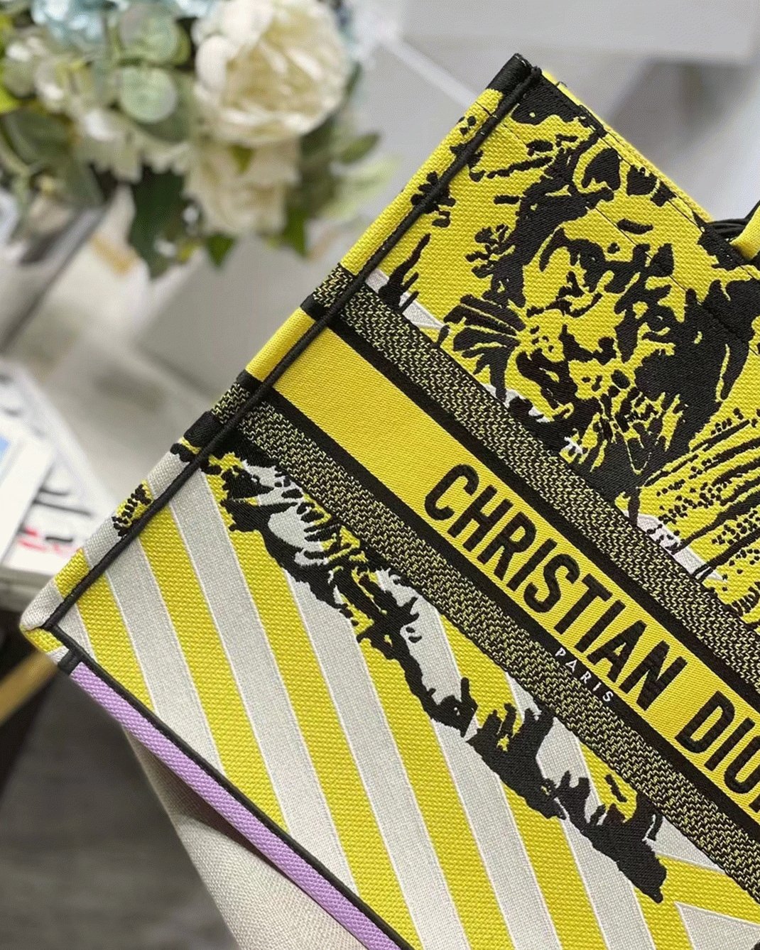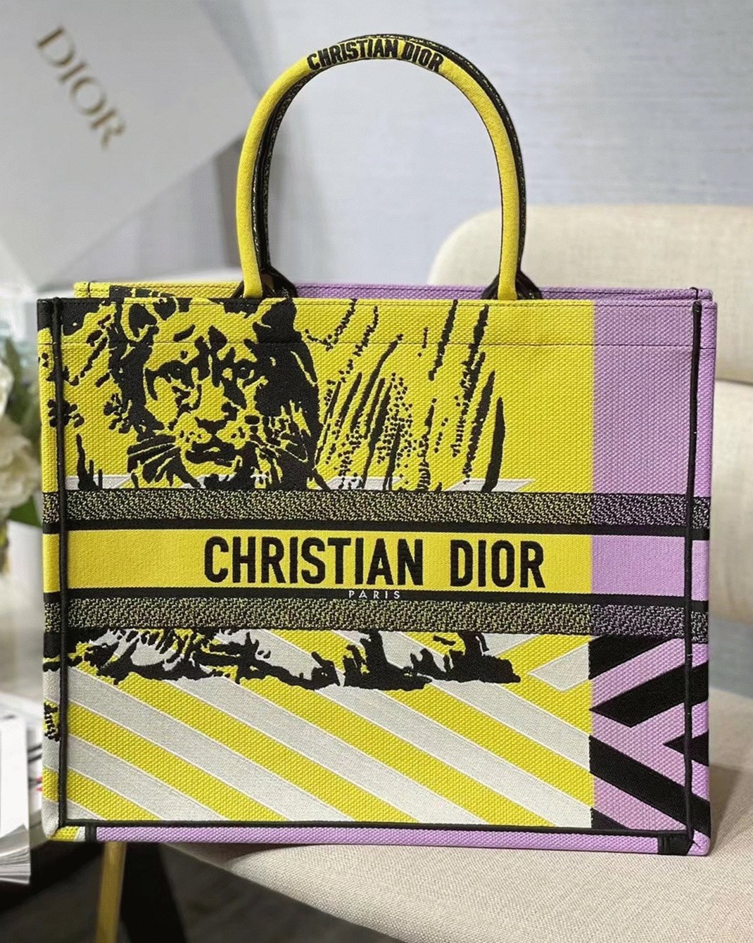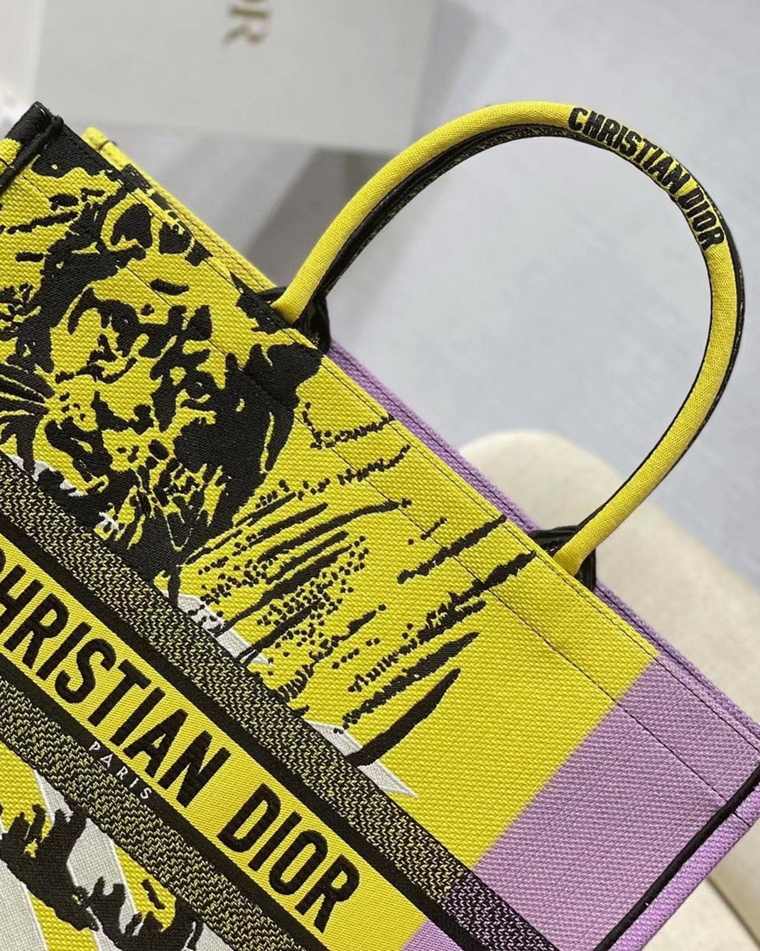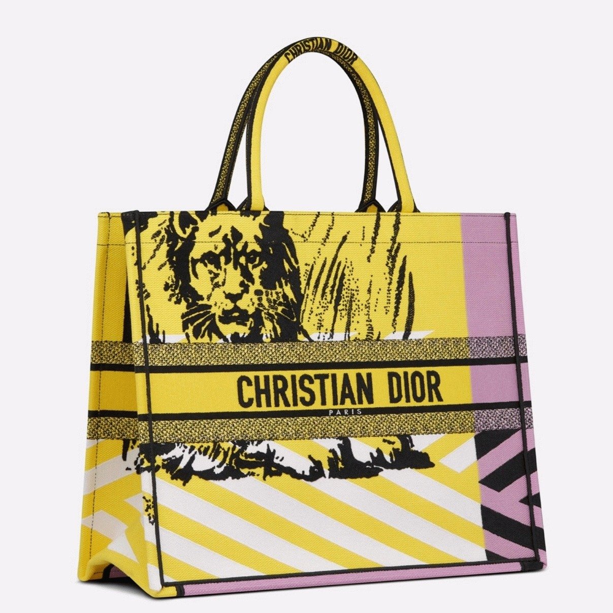 Dior Large Book Tote Bag Faux in Yellow D-Jungle Pop Embroidery