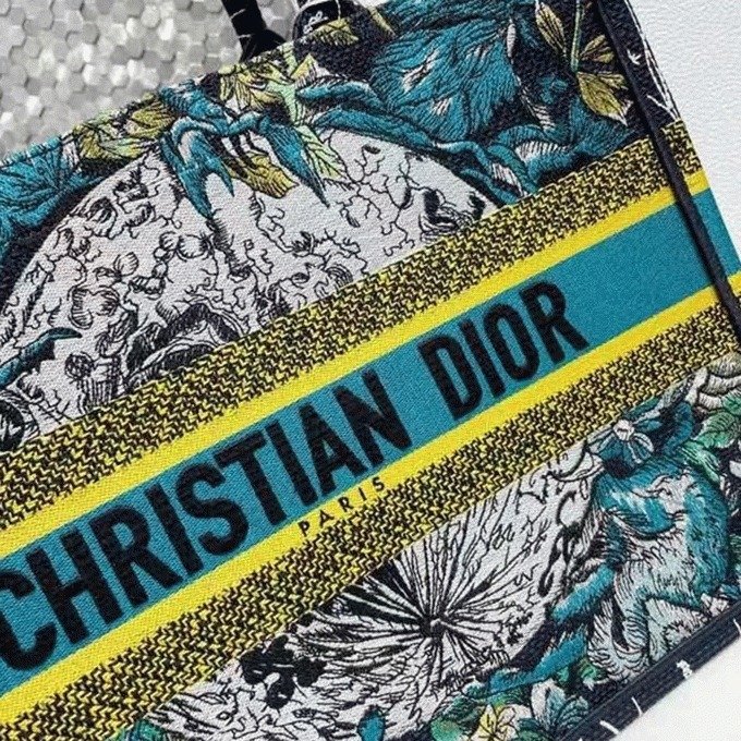 The Dior Book Tote, a signature piece from Diors creative director Maria Grazia Chiuri, has swiftly become a symbol of the Maisons style. Sized perfectly for carrying daily essentials, this edition is fully embroidered on blue canvas. The hand-cut material and fringed edges form a unique camouflage design, accentuated by the Christian Dior signature on the front. This tote showcases Diors exceptional craftsmanship and pairs perfectly with the Mitzah scarf for a polished look.