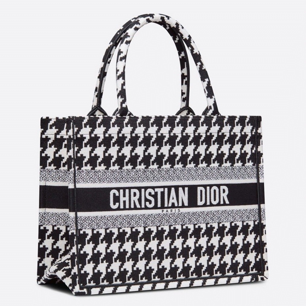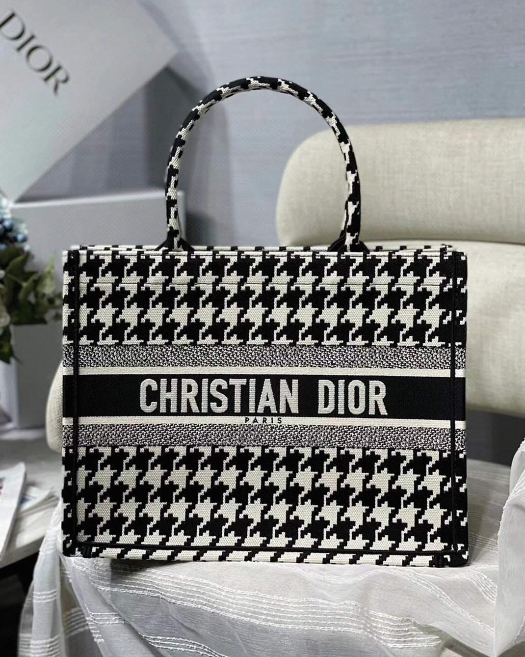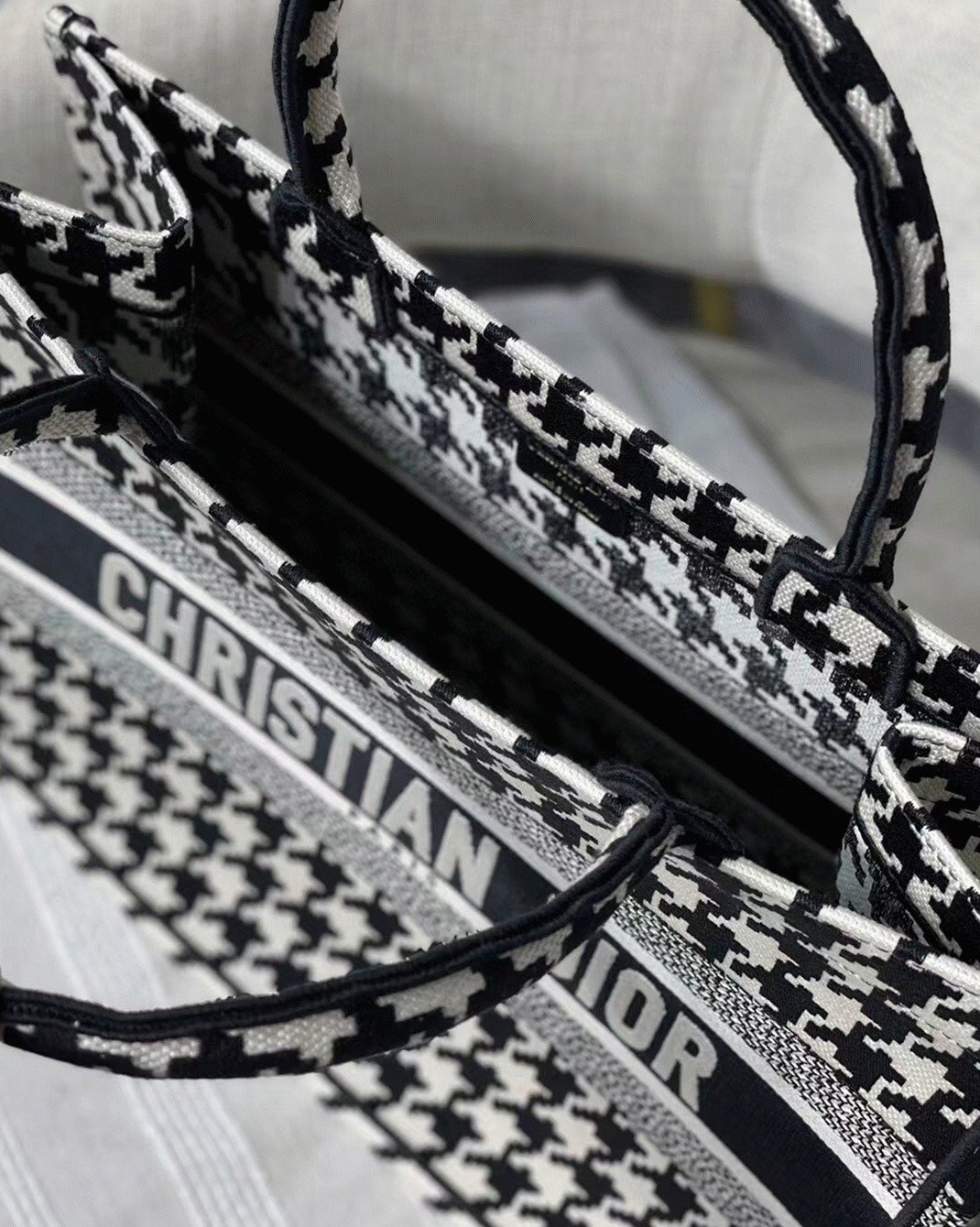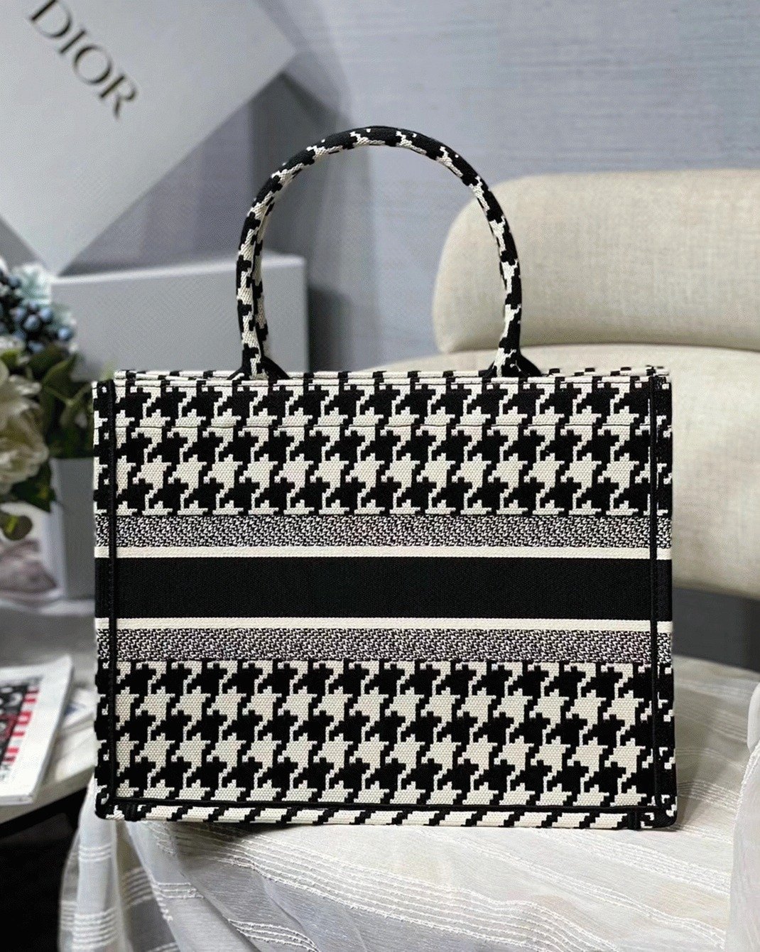 Dior Medium Book Tote Bag Replica in Black Houndstooth Embroidery