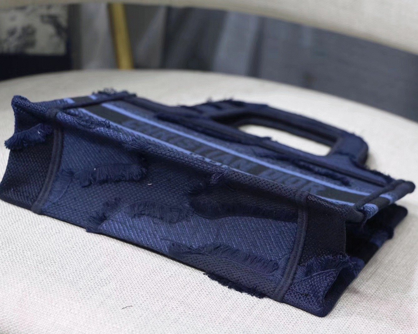 The Dior Book Tote, designed by Diors creative director Maria Grazia Chiuri, has swiftly become an emblematic piece for the Maison. This model, sized to hold everyday essentials, is fully embroidered on blue canvas. Its hand-cut fabric and fringed edges create a unique camouflage pattern, highlighted by the Christian Dior signature on the front. This tote represents Diors outstanding craftsmanship and pairs perfectly with the Mitzah scarf to complete your look.