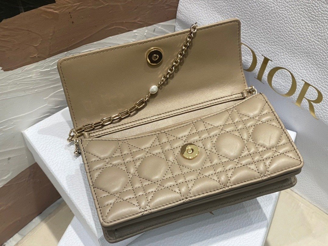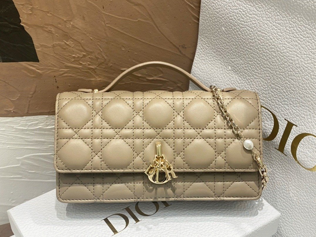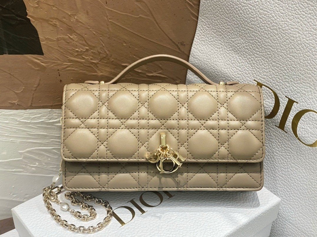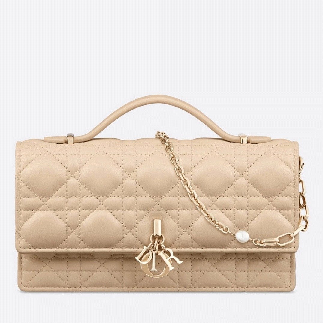 A new addition for Spring 2023, the Miss Dior mini bag brings refined charm and practicality to the Lady Dior collection. Crafted from lambskin with signature Cannage stitching, the piece features a flap adorned with D.I.O.R. charms. Thoughtfully designed with two compartments and built-in card slots, it easily holds everyday essentials. The bag is complete with a leather top handle and a detachable chain accented with resin pearls, offering both handheld and crossbody carrying options.
