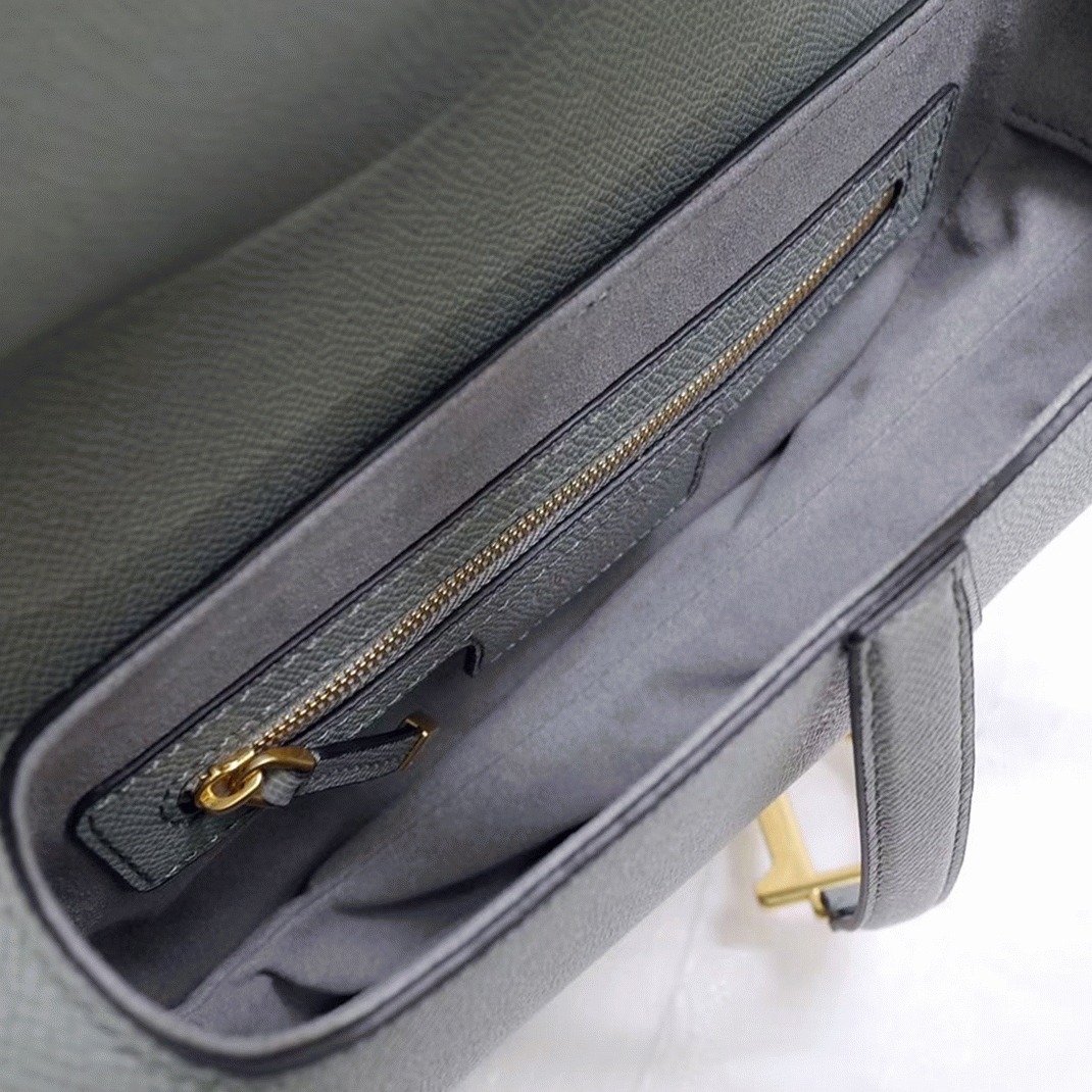 This renowned Saddle bag draws its inspiration from equestrian elegance, highlighted by its signature asymmetrical flap that mimics the curve of a saddle. The magnetic ‘D’ clasp is modeled after stirrup hardware, while the prominent ‘CD’ emblems on both sides of the handle reinforce its unmistakably Dior identity. Crafted from textured calfskin leather and accented with antique gold-finish metal hardware, the bag offers multiple styling optionseither hand-carried or worn over the shoulder, with the possibility of personalizing it using interchangeable straps.