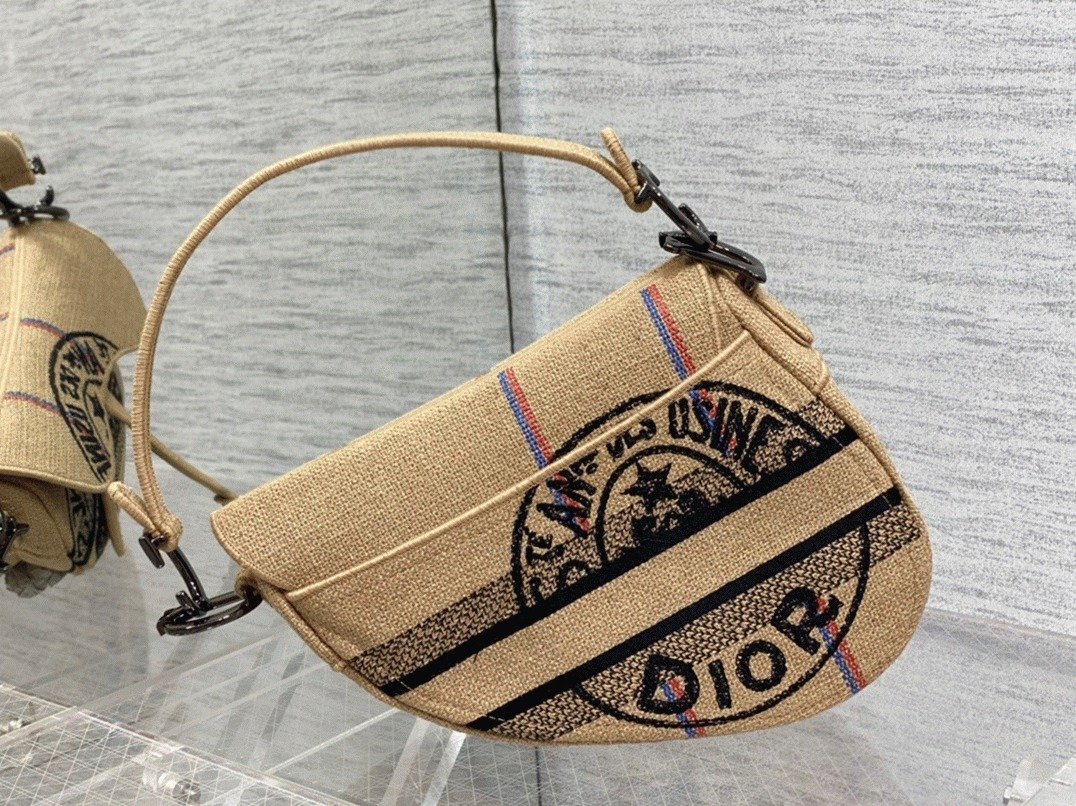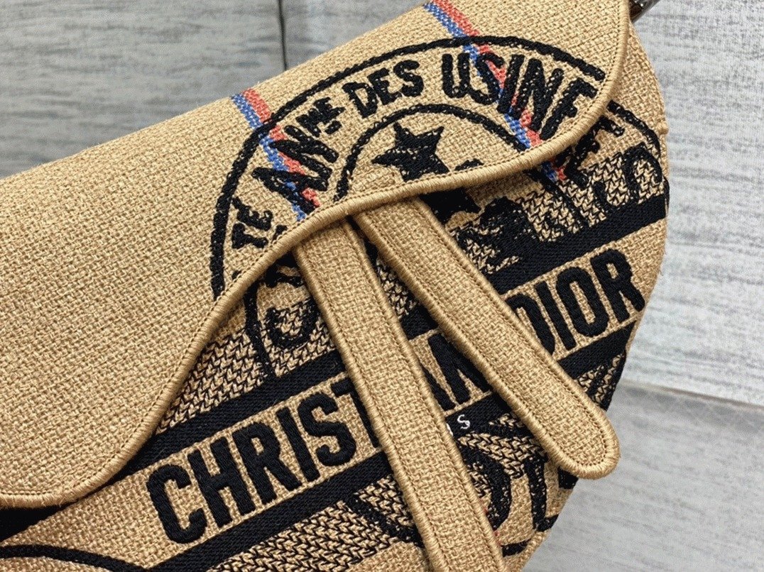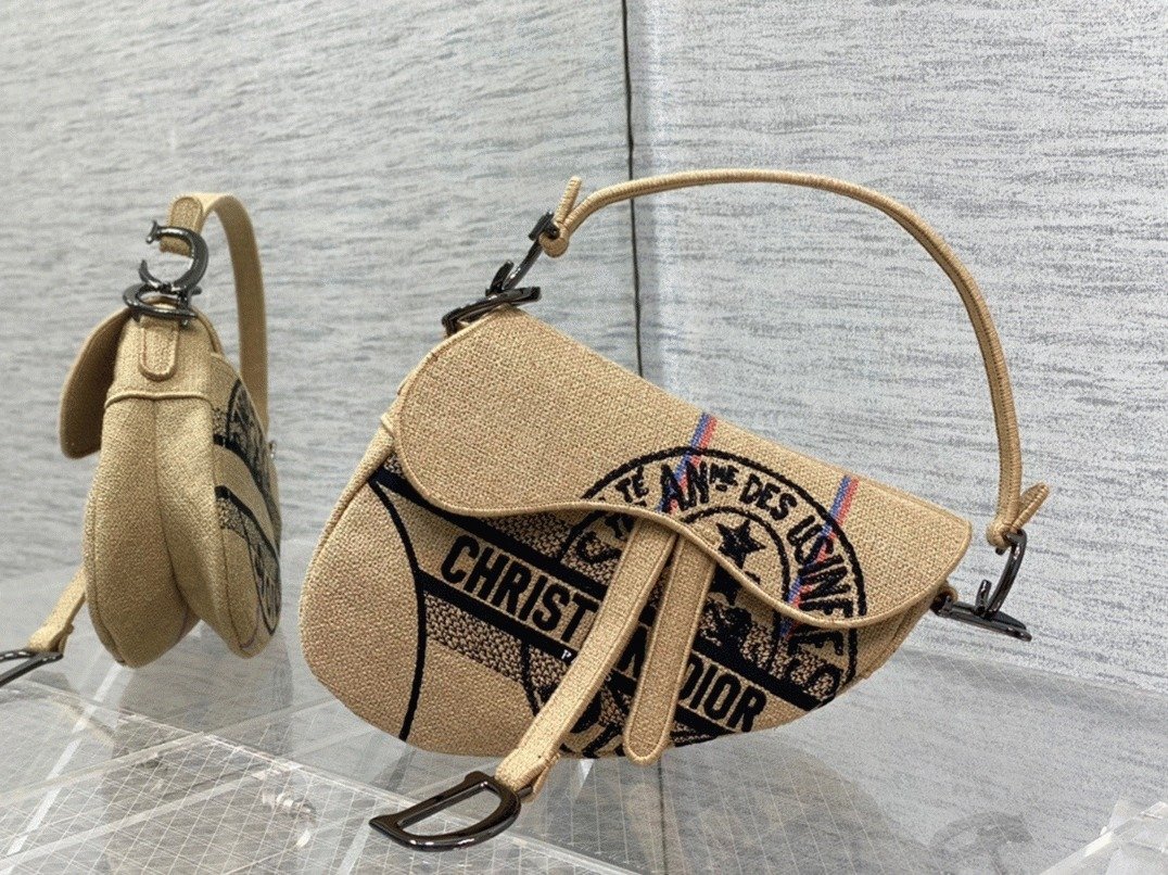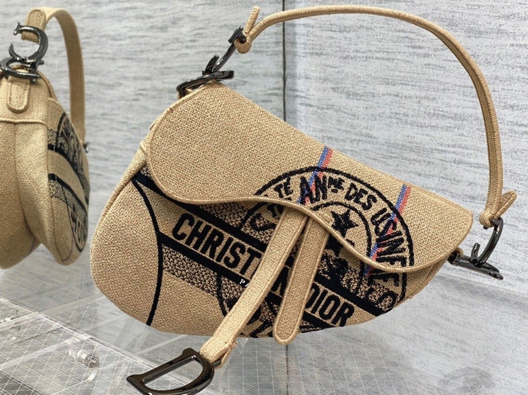Dior Saddle Bag Knockoff in Beige Jute Canvas with Dior Union Motif