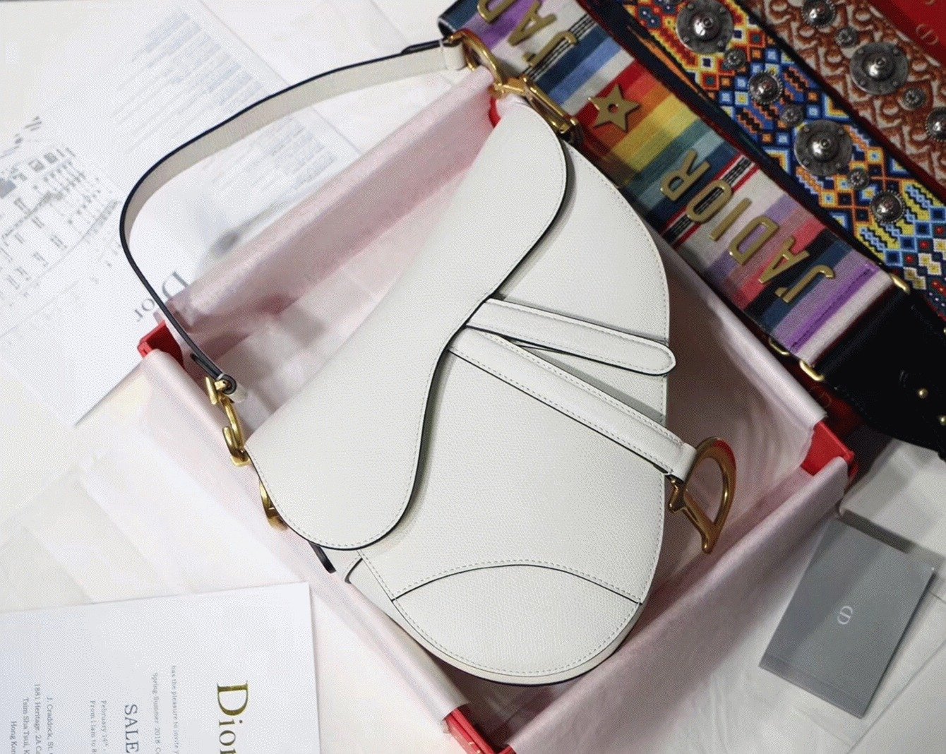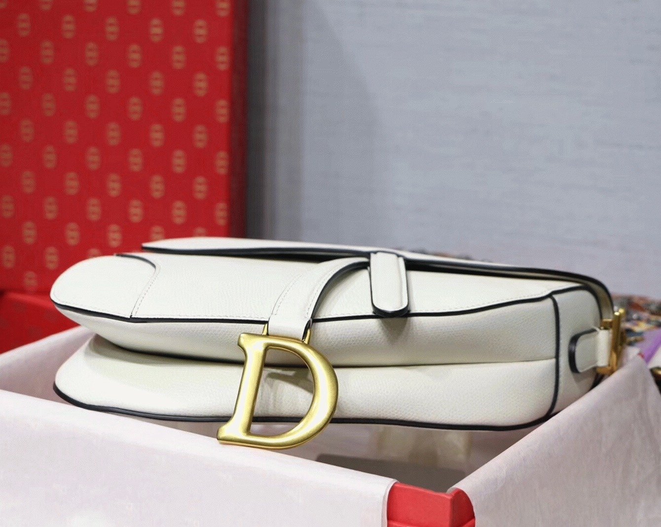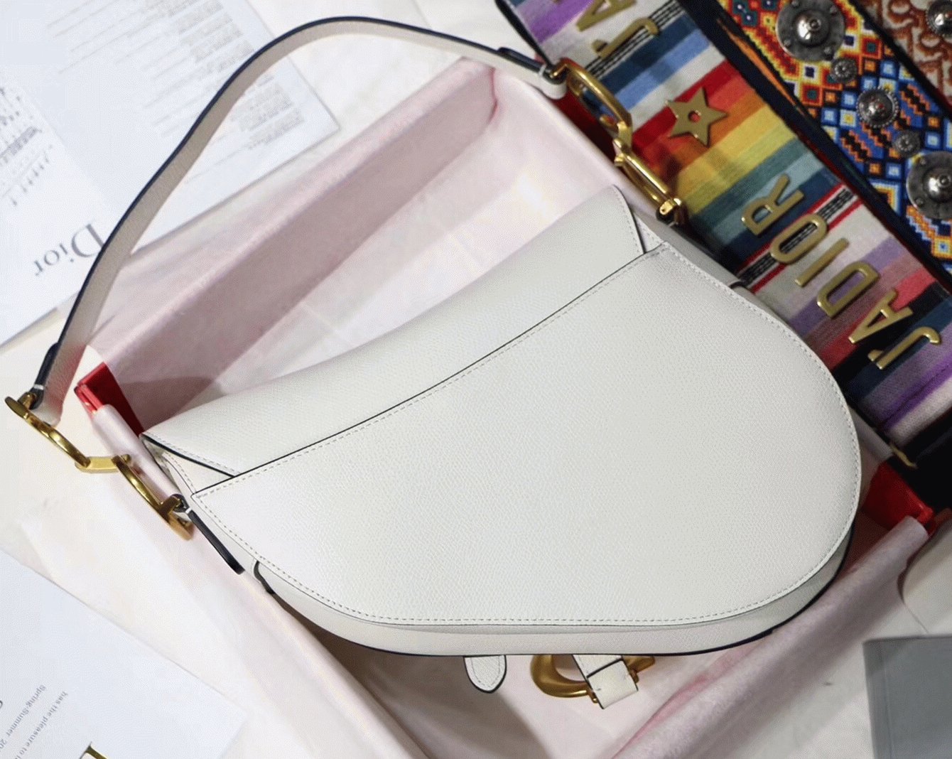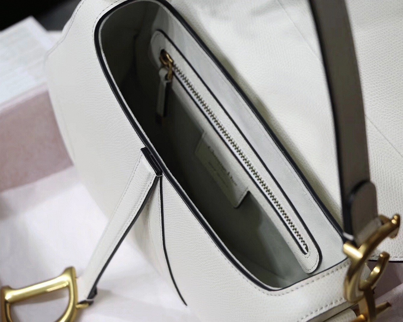 This renowned Saddle bag draws its inspiration from equestrian elegance, highlighted by its signature asymmetrical flap that mimics the curve of a saddle. The magnetic ‘D’ clasp is modeled after stirrup hardware, while the prominent ‘CD’ emblems on both sides of the handle reinforce its unmistakably Dior identity. Crafted from textured calfskin leather and accented with antique gold-finish metal hardware, the bag offers multiple styling optionseither hand-carried or worn over the shoulder, with the possibility of personalizing it using interchangeable straps.