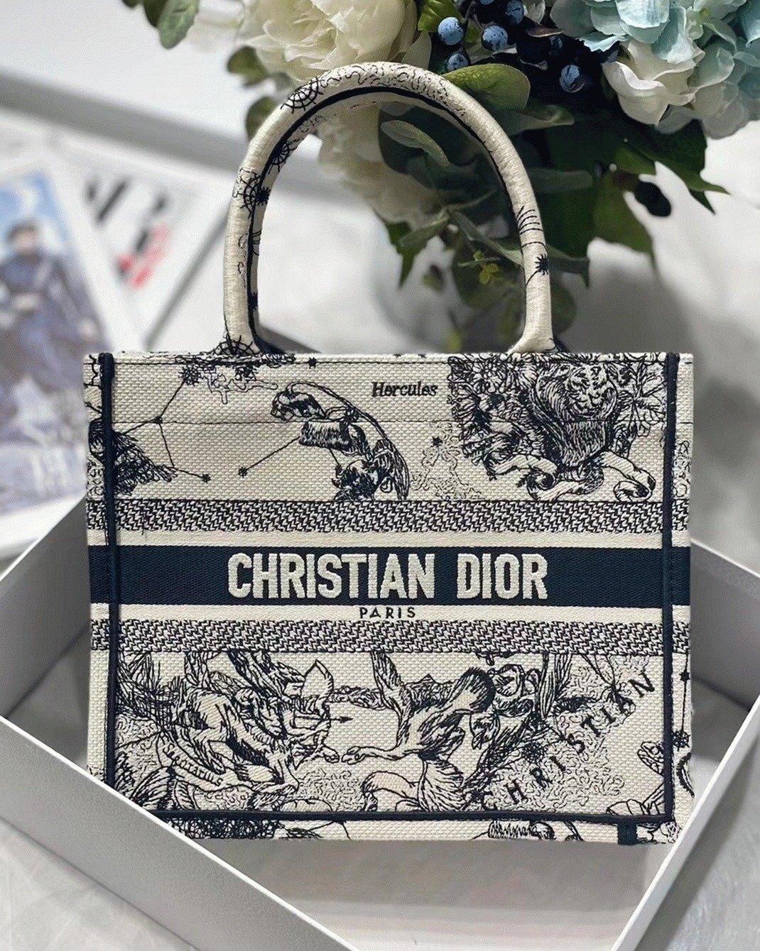 The Dior Book Tote, originally designed by Diors Creative Director Maria Grazia Chiuri, has become a defining piece of the Dior collection. Crafted to carry all your everyday necessities, this compact tote is fully embroidered with the iconic blue Dior Oblique pattern and prominently displays the ‘CHRISTIAN DIOR PARIS’ signature on the front. Reflecting the Maison’s expert craftsmanship, this tote is designed to be elegantly carried by hand.