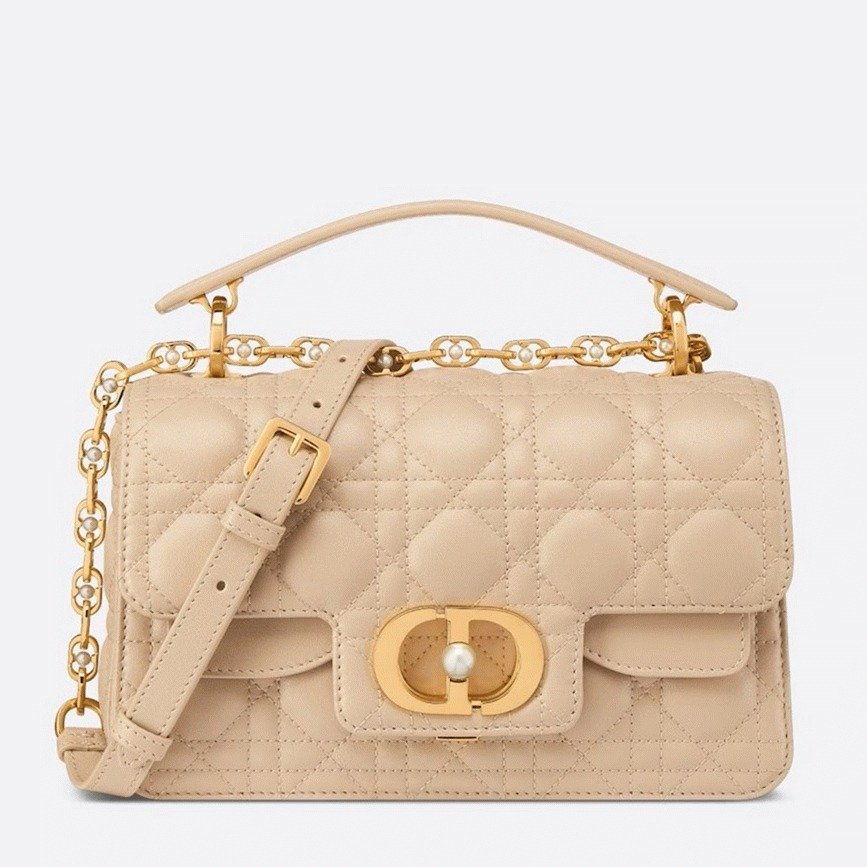 New for Summer 2024, the Dior Jolie Top Handle bag blends refined style with everyday practicality. Made from smooth calfskin and finished with Cannage stitching, the design features a double flap closure and a front ‘CD’ clasp embellished with a delicate white resin pearl. Inside, the bag offers three compartments and a zip pocket, providing ample space for daily essentials, whether for daytime outings or evening events. The detachable top handle pairs with an adjustable chain strap that includes a leather insert and ‘CD’ links, also adorned with white resin pearls, allowing the bag to be worn by hand, on the shoulder, or across the body.