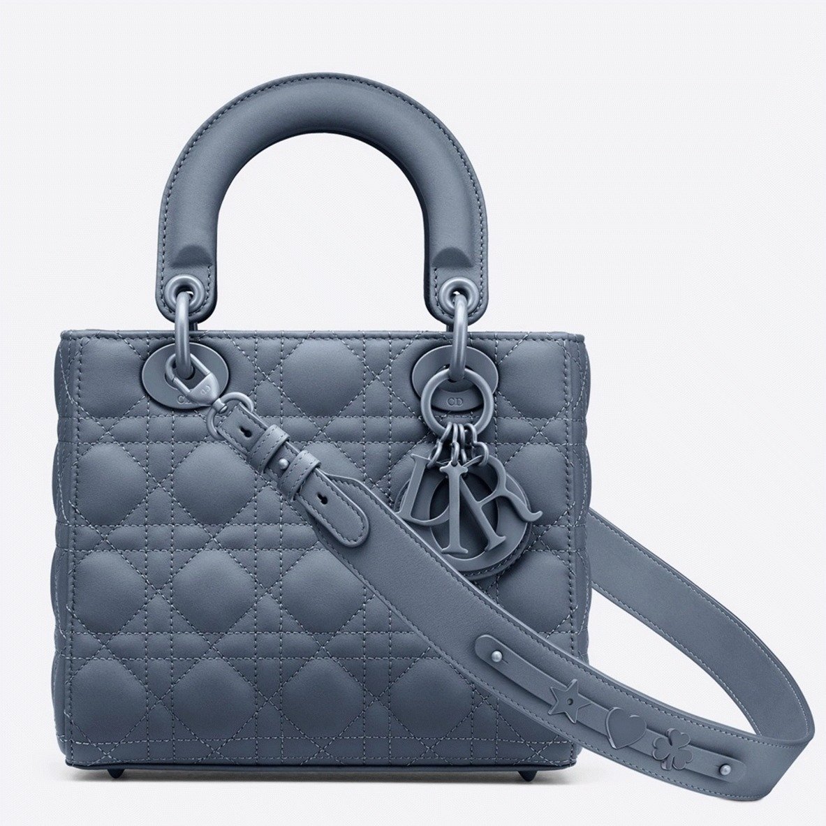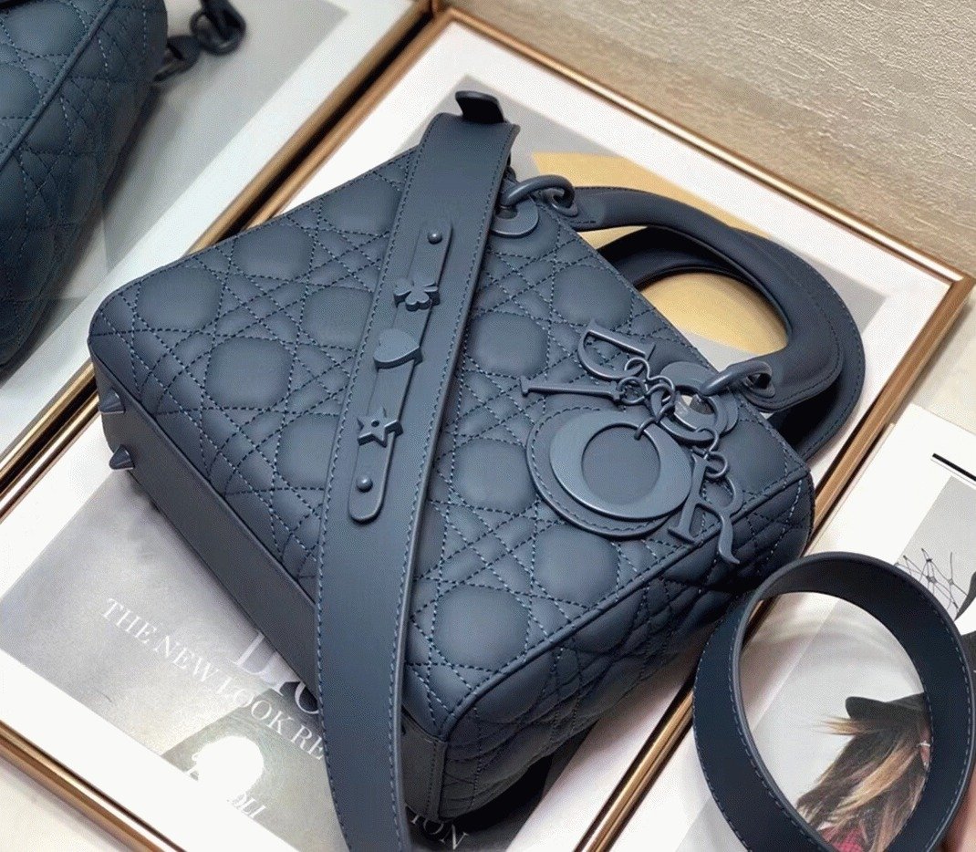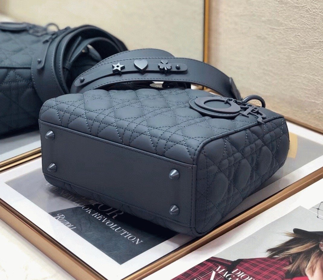 The Lady Dior My ABCDior bag embodies the House’s vision of elegance and beauty. Sleek and sophisticated, this timeless piece is crafted from lambskin with Cannage stitching, creating a distinctive quilted texture. The pale gold-finish metal ‘D.I.O.R.’ charms adorn and highlight the silhouette. It includes a shoulder strap that can be customized with badges, allowing for versatility as it can be carried by hand or worn crossbody.