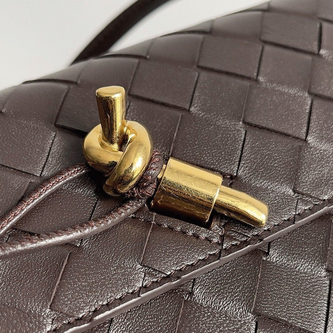 The Bottega Veneta “Andiamo” bag is part of the collection introduced by Matthieu Blazy as Creative Director. The bag is intricately handwoven using leather strips, featuring the signature intrecciato technique. A gold-plated knot adorns the front, and the interior reveals a compact space with a zip pocket for organizing small items. The shoulder strap can be tucked in, transforming the bag into a clutch.
