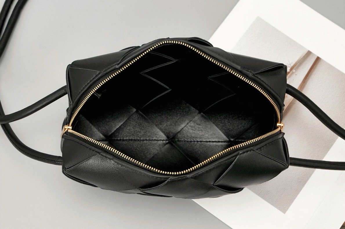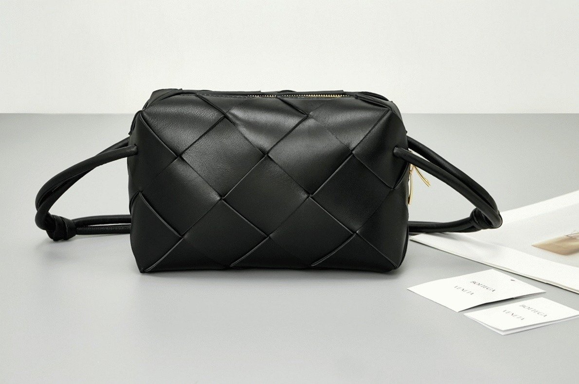The updated version of the small cassette camera bag features the signature Intrecciato design, but with a softer twist. This version is defined by its gently rounded corners, two gold-toned zippers at the top, and slender straps, perfect for wearing cross-body.