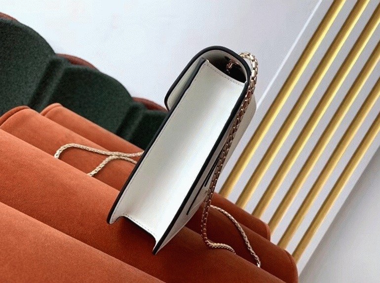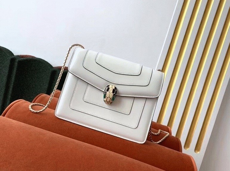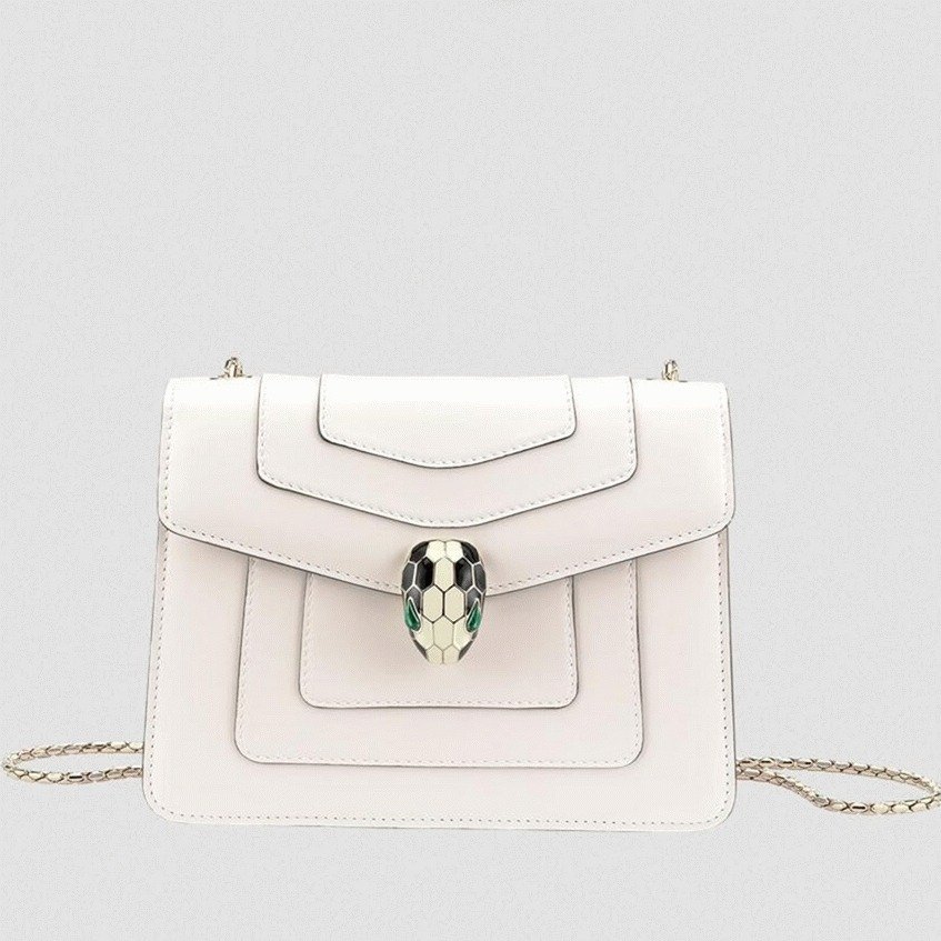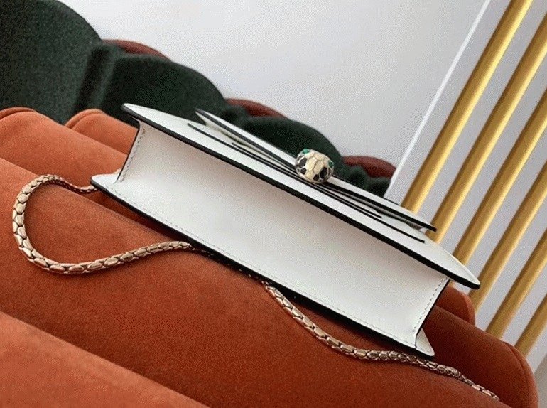The Serpenti Forever small crossbody bag enhances its timeless allure with premium materials and sophisticated color contrasts. Crafted from smooth calfskin leather, it features the signature Serpenti snakehead clasp, designed in light gold-plated brass and adorned with black and white agate enamel scales, along with striking green malachite eyes. The chain strap, shaped like a snake’s body, adds a distinct touch, drawing inspiration from Bvlgari’s celebrated 1960s Serpenti jewelry collection.