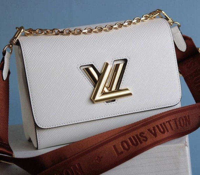Louis Vuitton Epi Leather Twist MM Bag In Optic White With Jacquard Strap