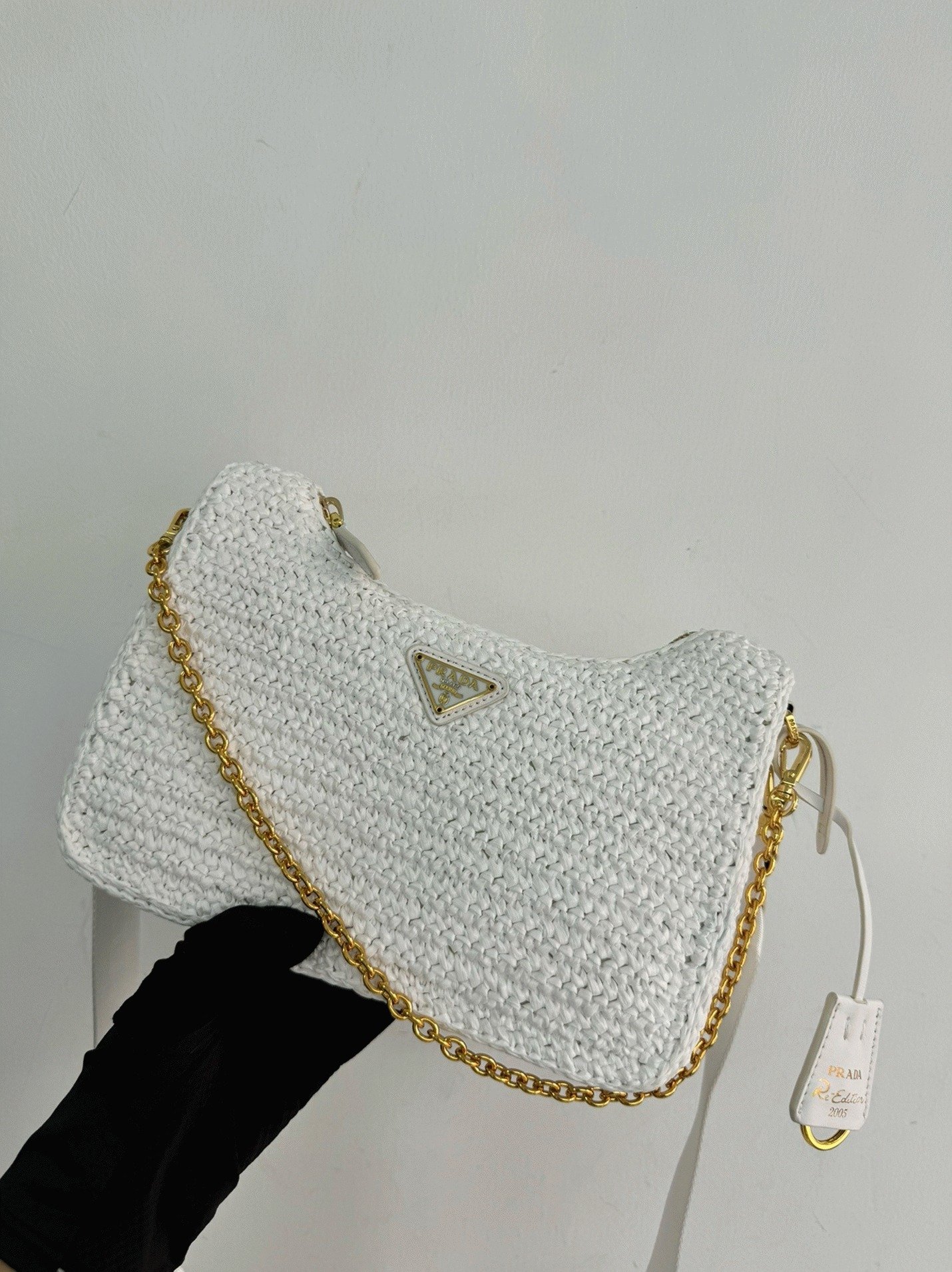 The Prada raffia bag is a must-have for your vacation wardrobe, perfectly embodying the tranquil spirit of an island getaway with its detailed woven design. Part of the Spring/Summer 2022 Tropico collection, this vibrant piece draws inspiration from tropical plants and colors. This refreshed classic serves as the ideal seasonal accessory, effortlessly bringing a beachy, bohemian vibe wherever you go.