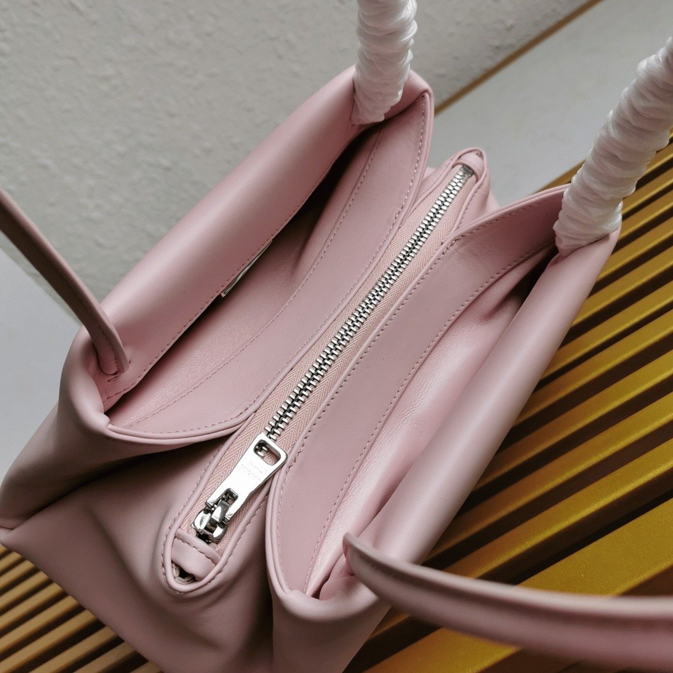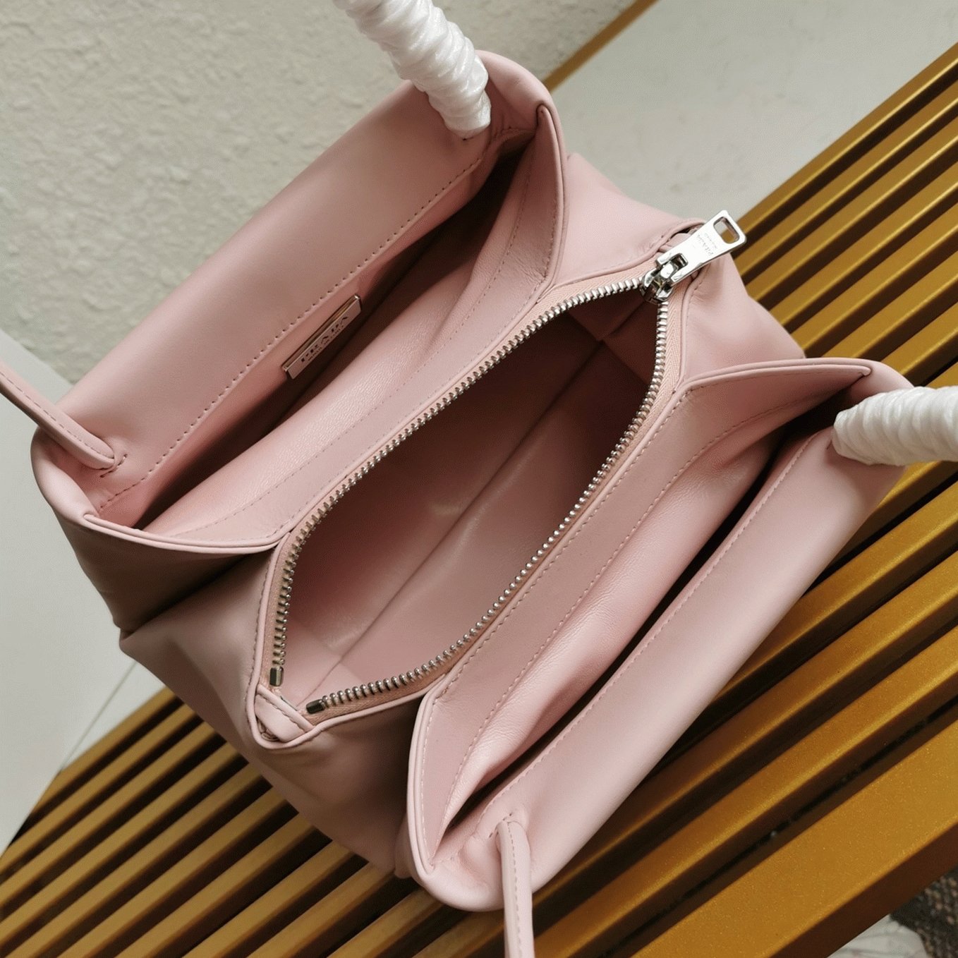 Interior lined with Nappa leather and includes a central zip pocket