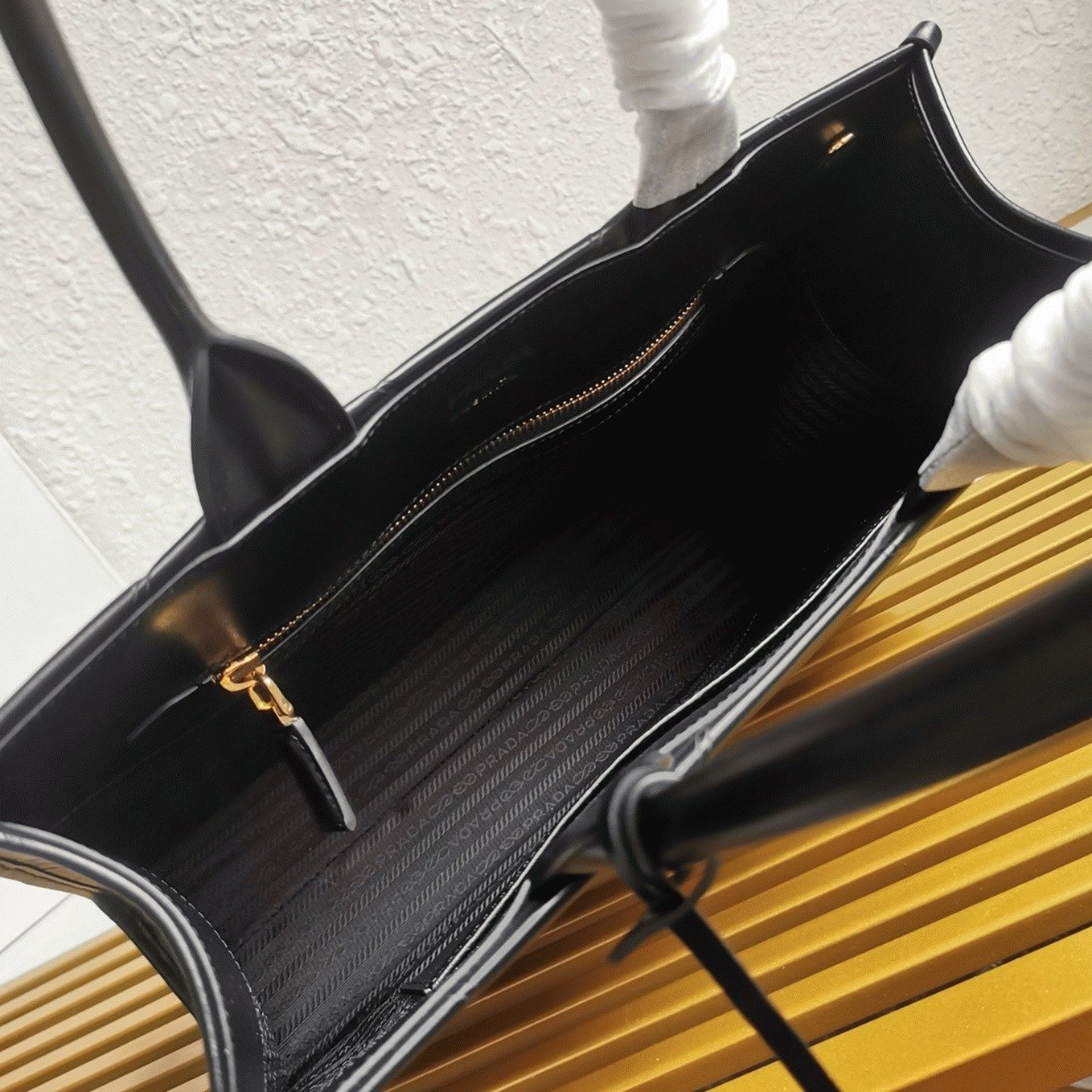 Metallic Prada logo lettering on the front