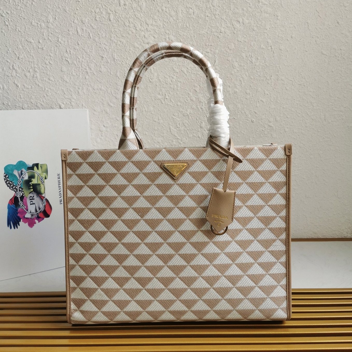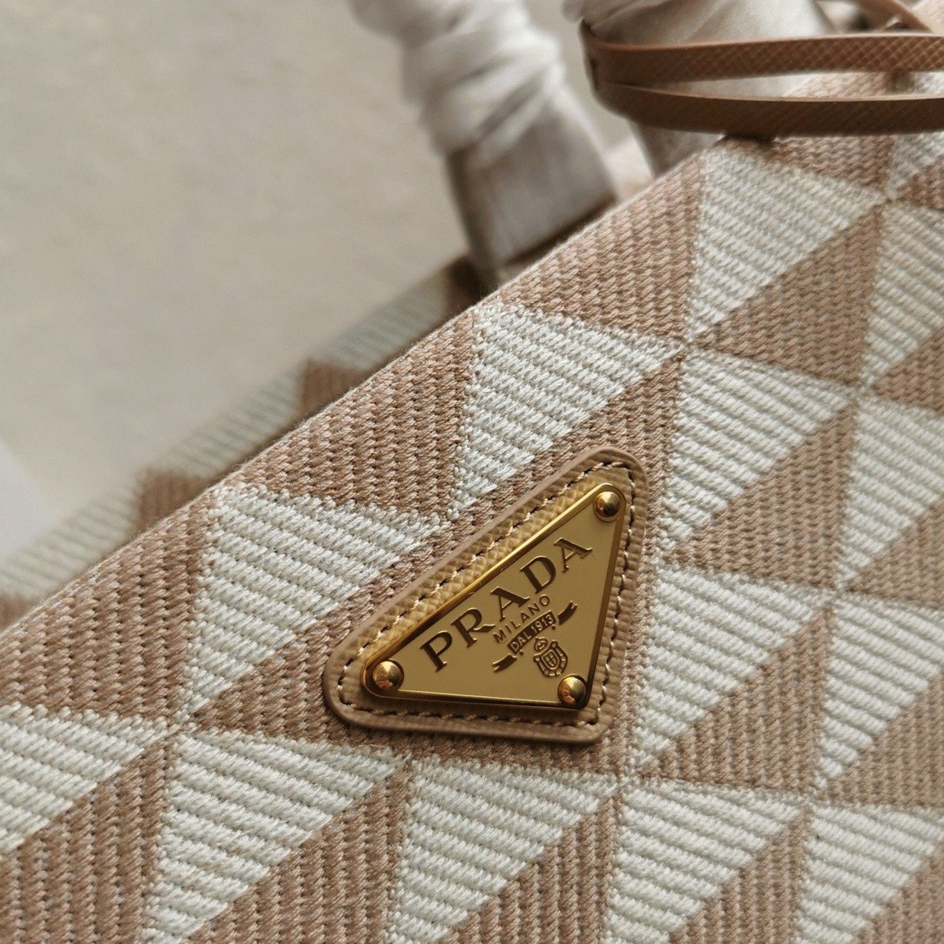 Prada Symbole Small Bag Fake in Beige/White Jacquard Fabric