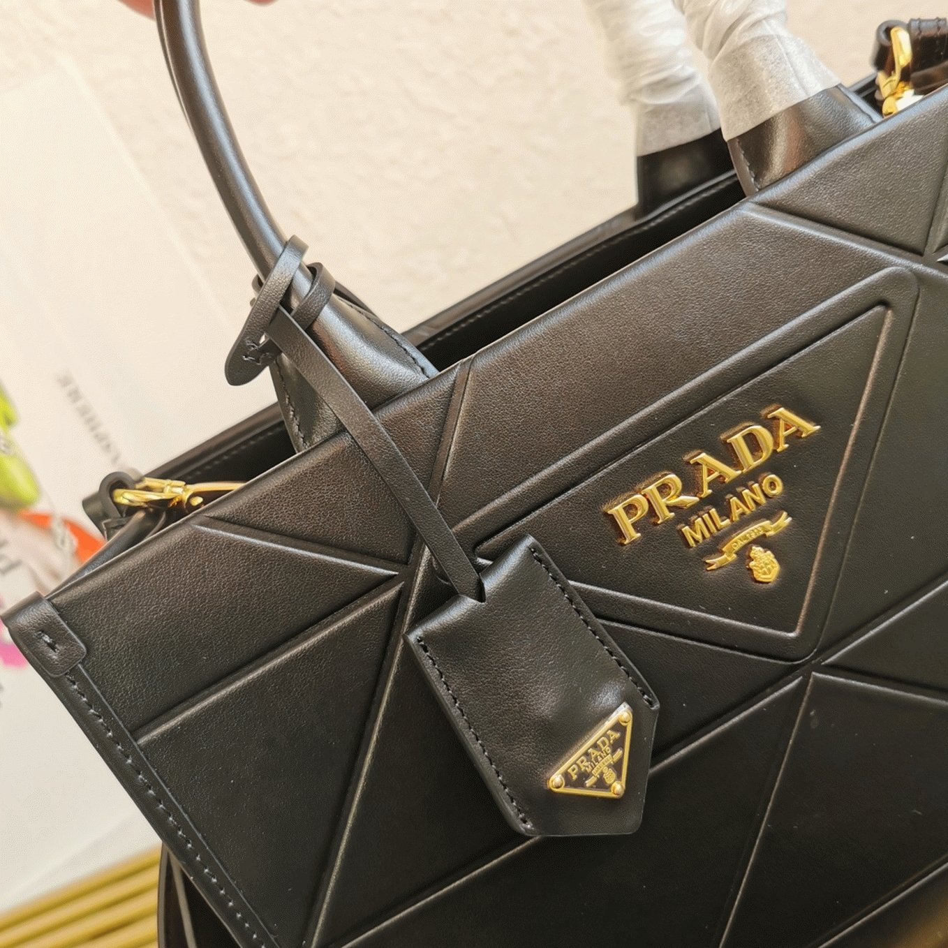 Metallic Prada logo lettering on the front