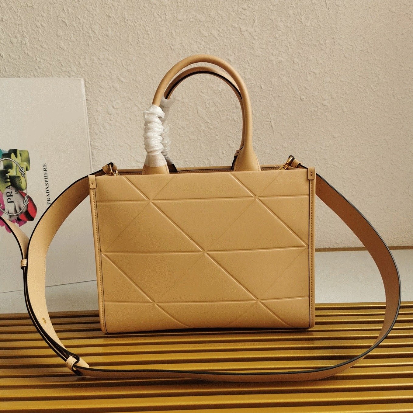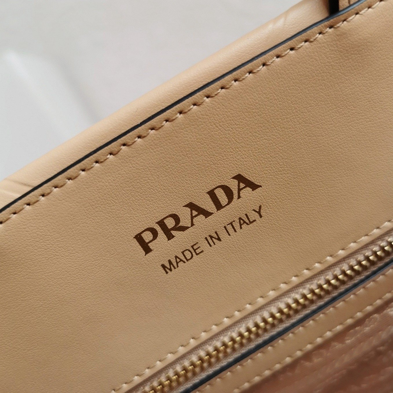Metallic Prada logo lettering on the front