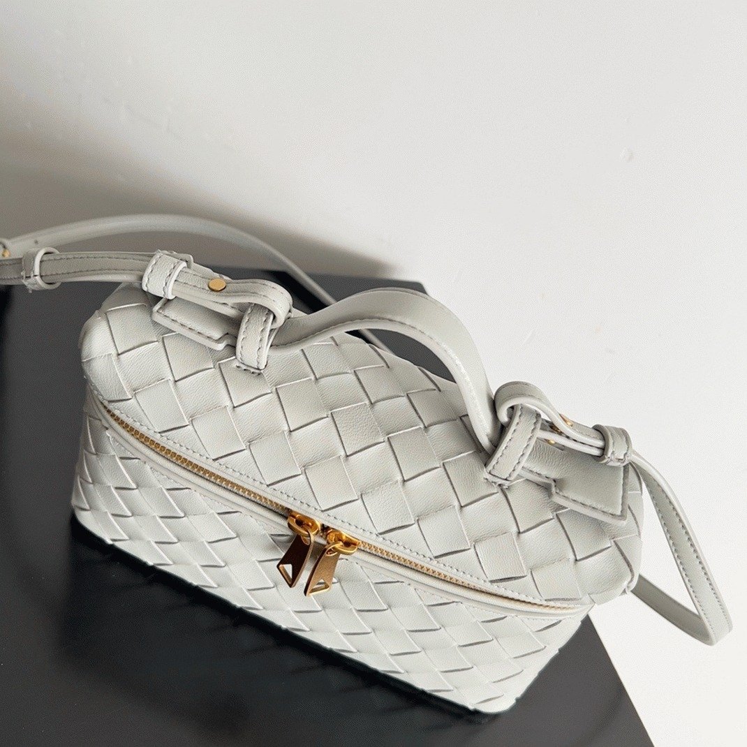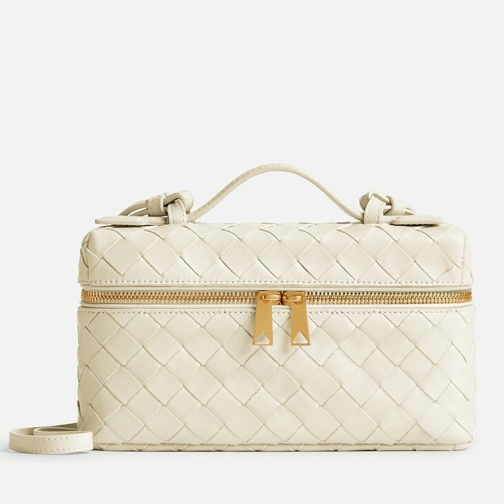 This Vanity Case Bag is crafted from soft leather strips using the brand’s iconic Intrecciato weaving technique. It is spacious enough to hold essentials like a phone, cardholder, and keys. The bag can be carried by its top handle or worn cross-body with the long detachable strap.
