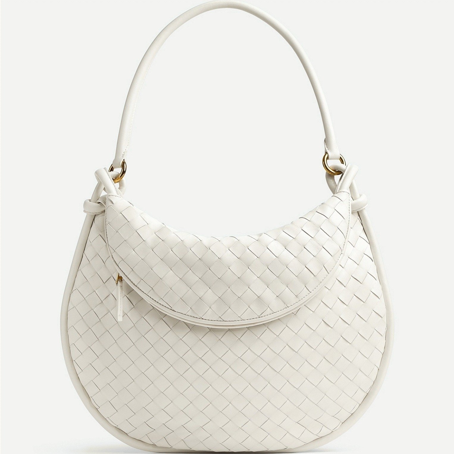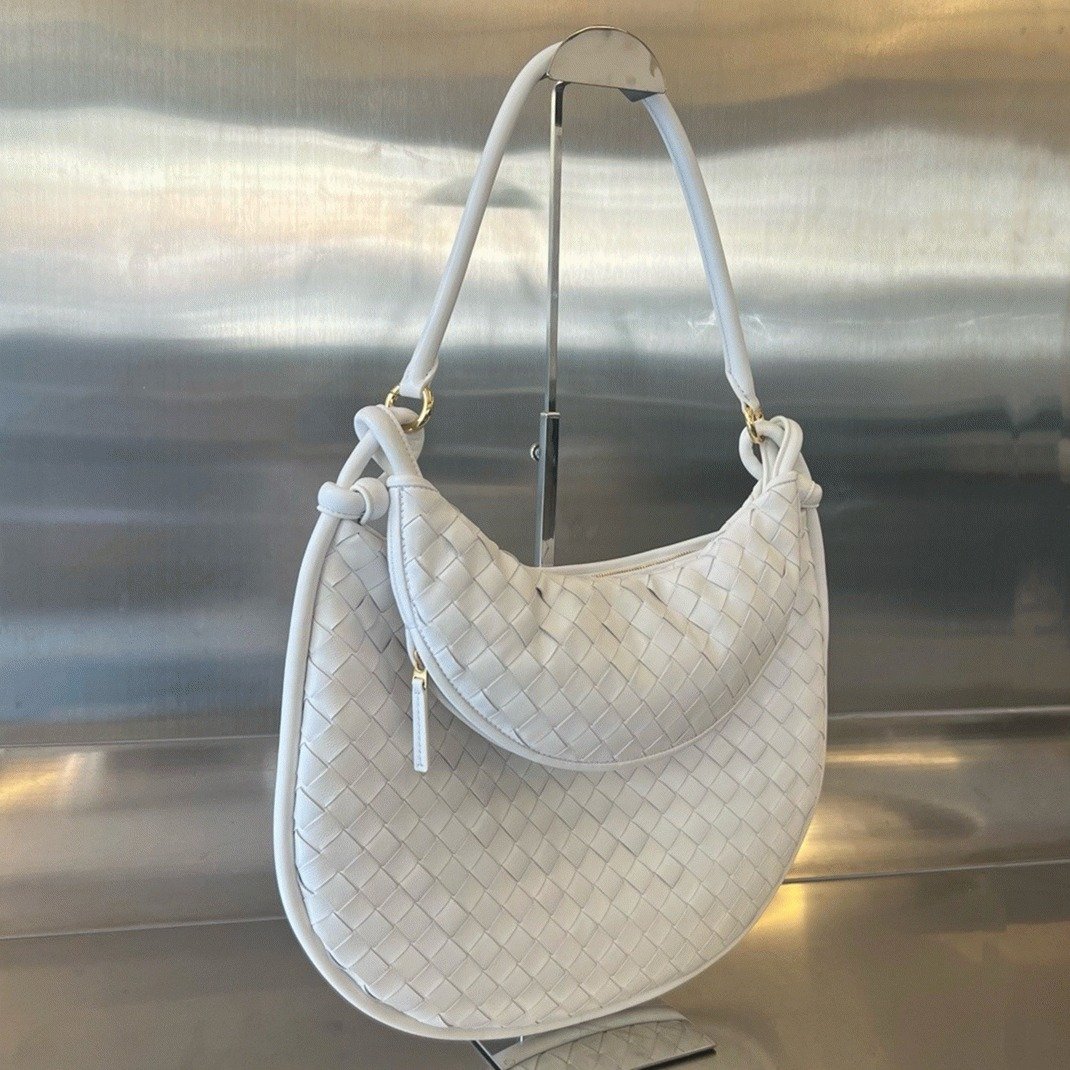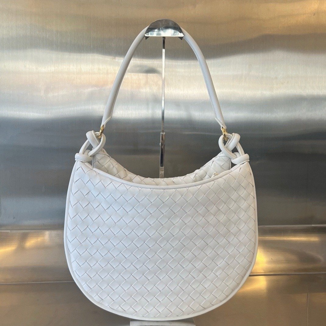 The Gemelli shoulder bag by Bottega Veneta is a spacious piece, especially in its larger size. Crafted from soft leather, it features the brand’s signature intrecciato weaving. The bag’s unique design is defined by its half-moon shape, with a smaller crescent-shaped pouch resting on top of the main compartment.