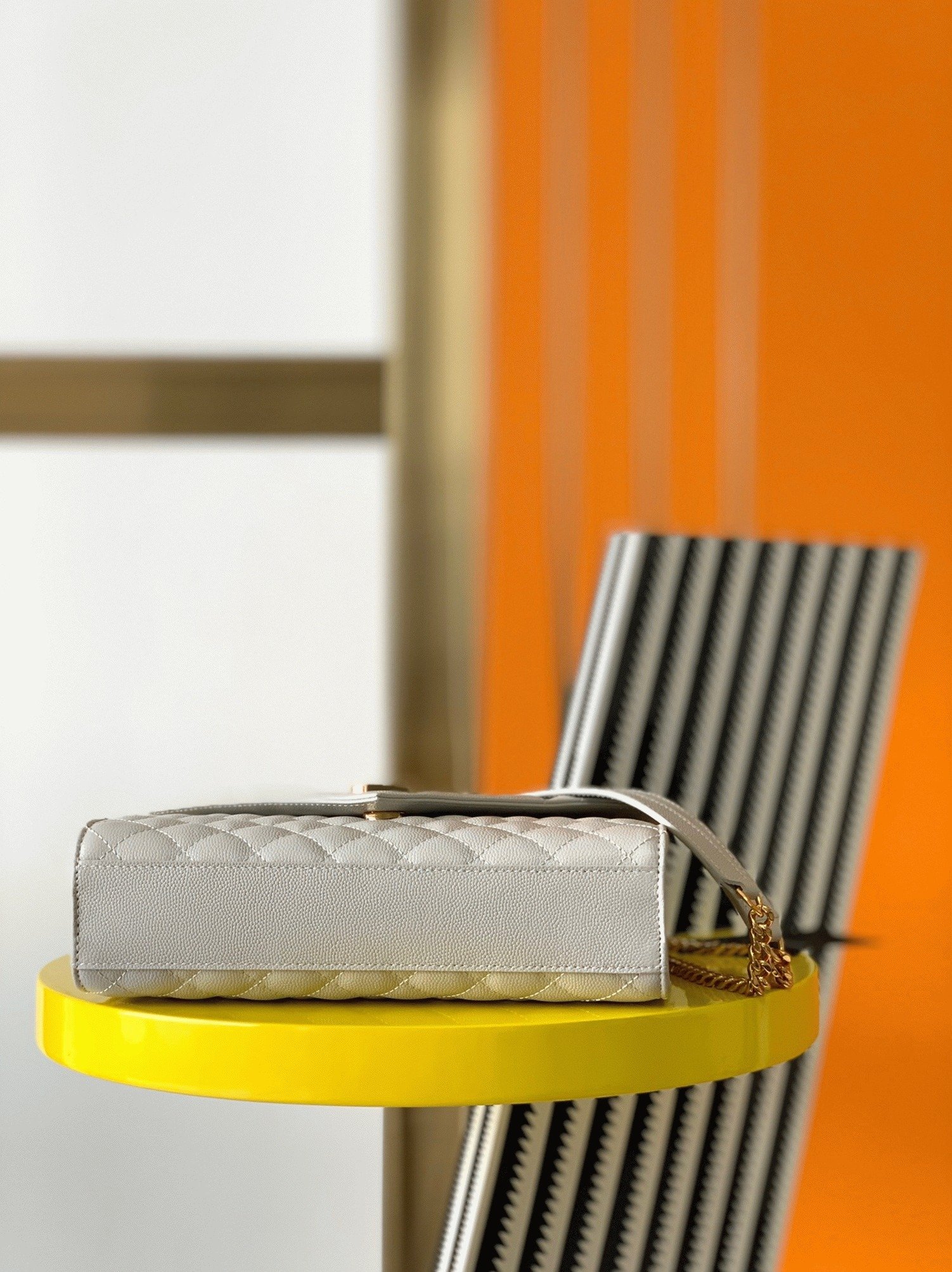 The Envelope Bag derives its name from its unique shape and flap closure. It’s crafted from grained leather and quilted with three different patterns, which highlight the brand’s iconic YSL logo. The top handle offers an elegant way to carry it, while the interior pockets are perfect for organizing cards and cash.