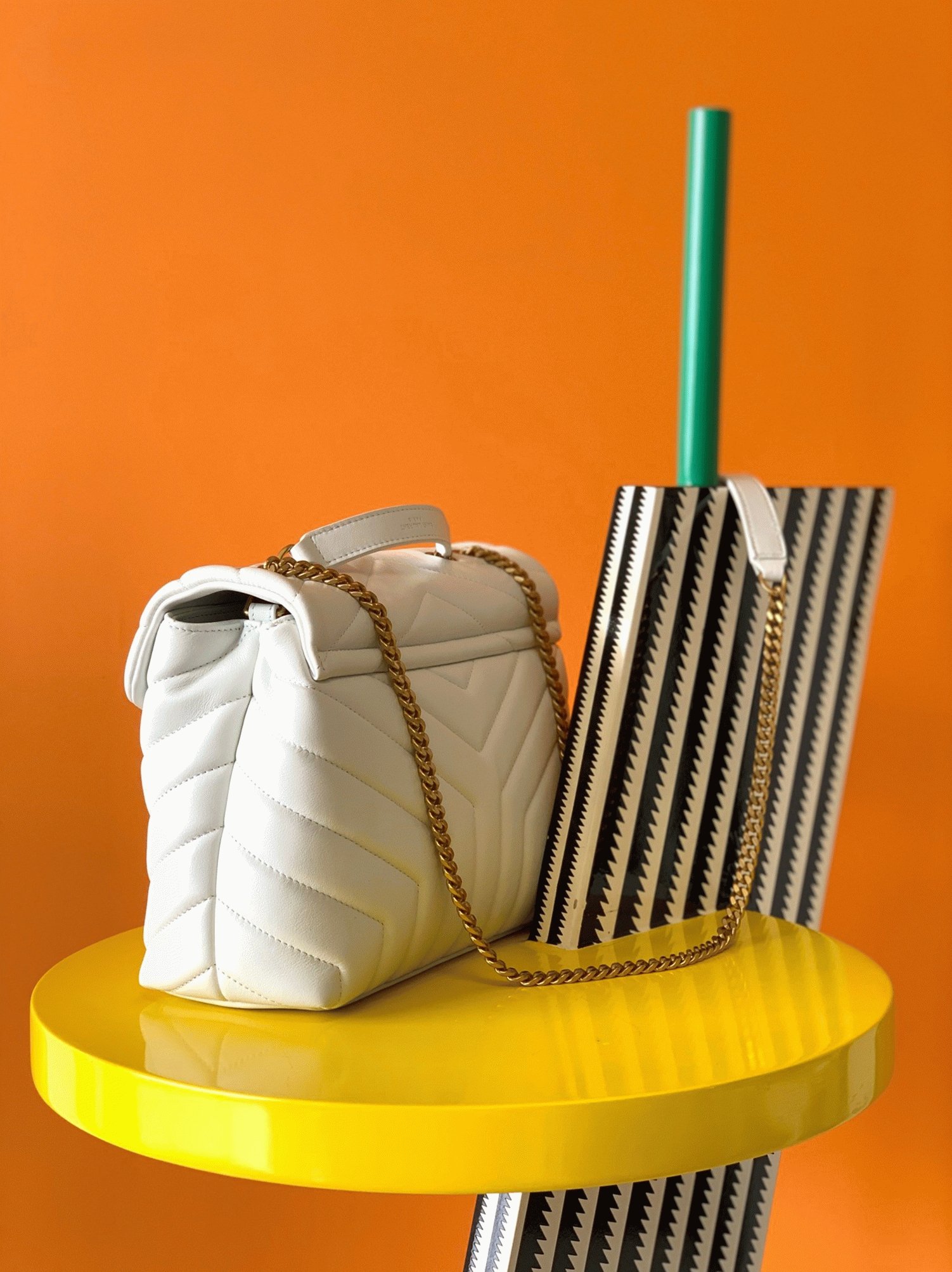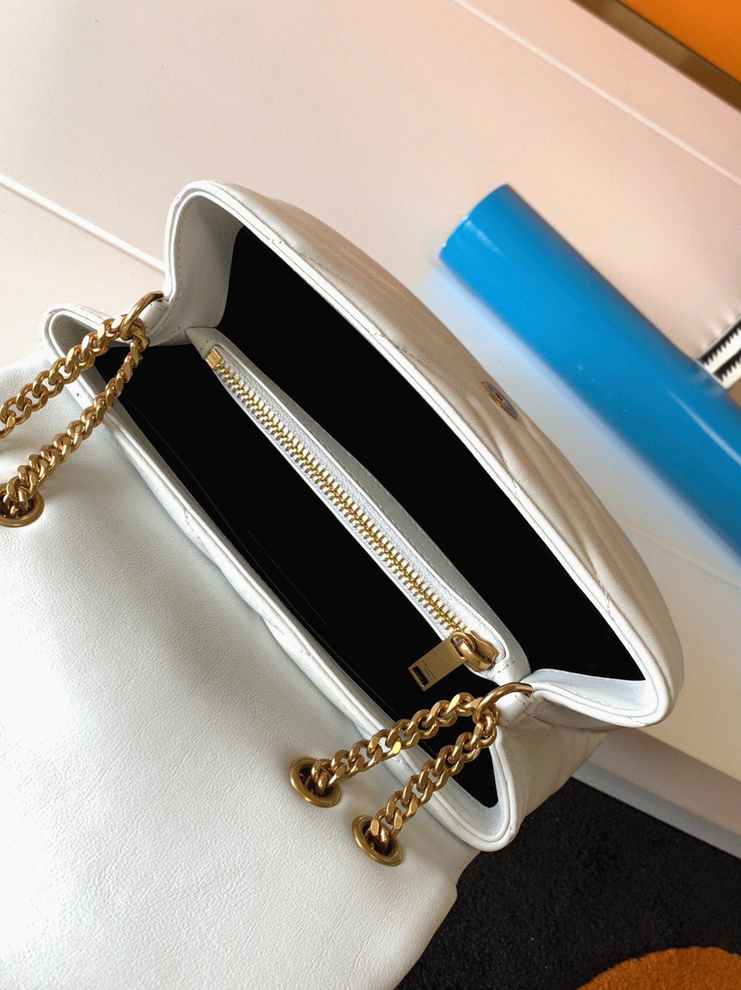 The YSL monogram, created in 1962 by Adolphe Jean Marie Mouron, remains a symbol of luxury and quality. This quilted bag is crafted from smooth leather and features signature chevron stitching. While compact, it offers an organized interior with two compartments, one zippered pocket, and three card slots.