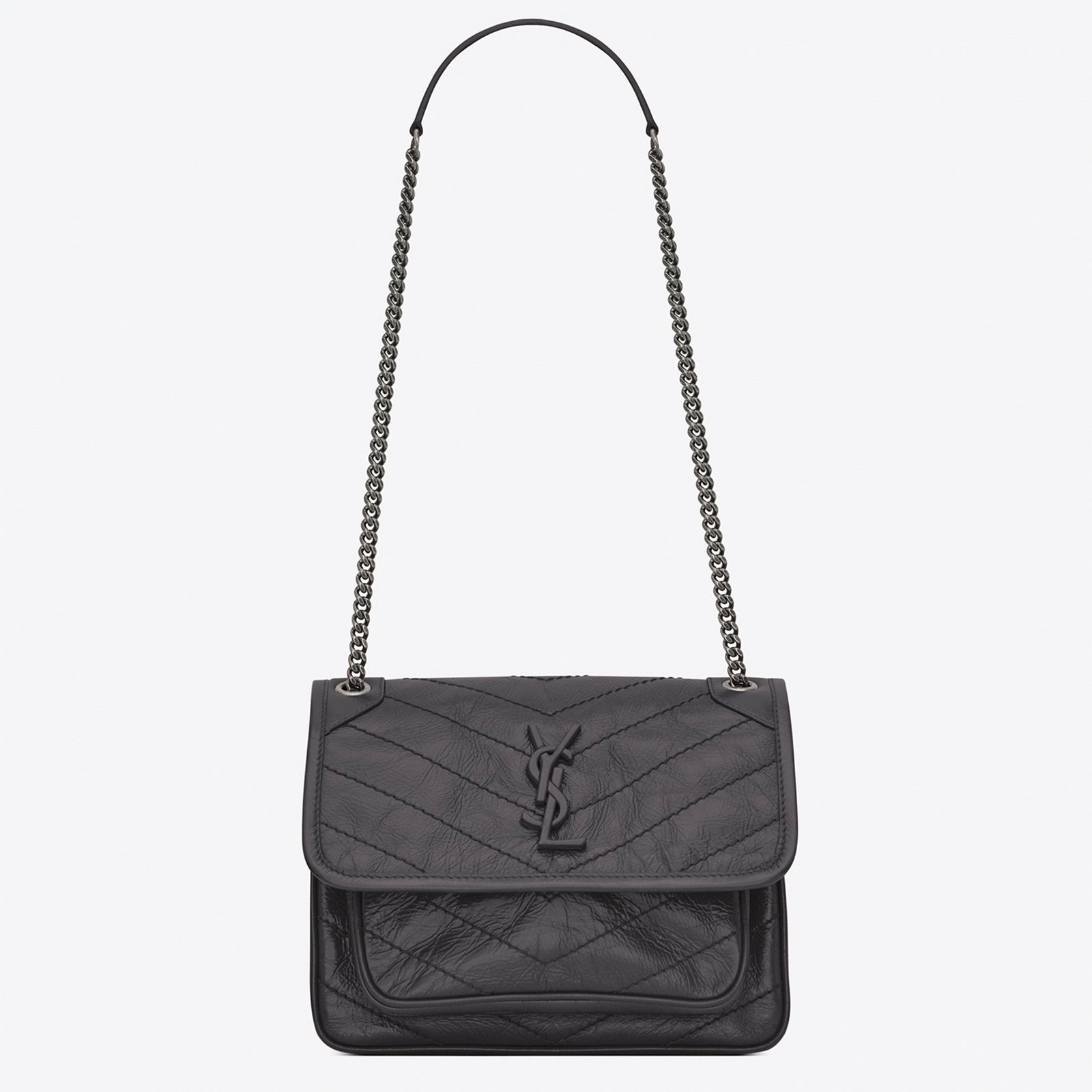 The Niki Baby Chain Bag from Saint Laurent is designed with intentional crinkling and texture to give it a vintage-inspired look. Made from crinkled calfskin, it features an adjustable sliding strap and a logo plaque at the top. The compact interior is well-organized, providing space for your essentials such as a compact, cardholder, and phone.