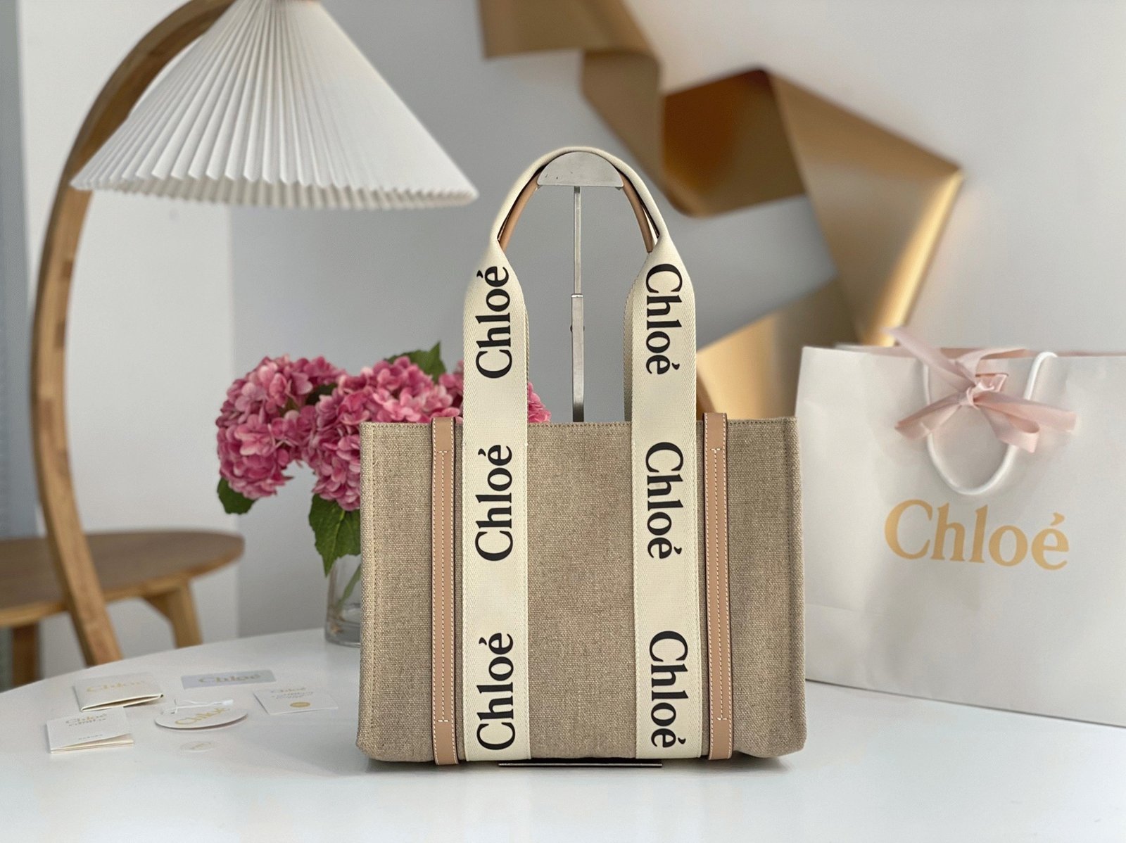 Top Quality Fake Chloe Woody Medium Tote Bag in Linen Canvas with Beige Leather
