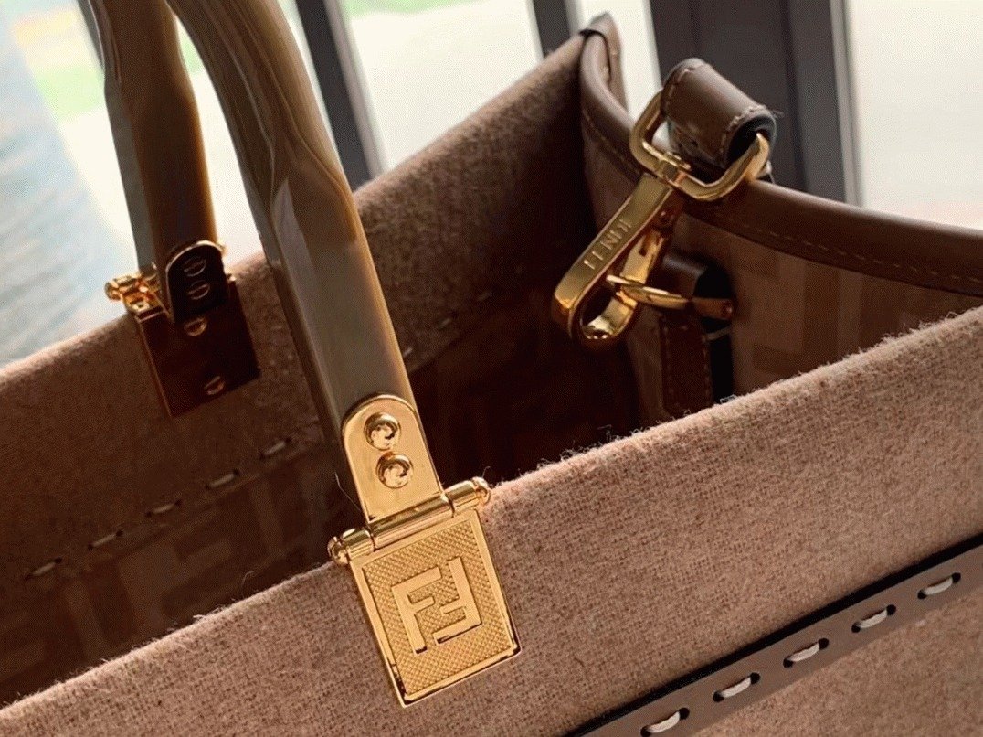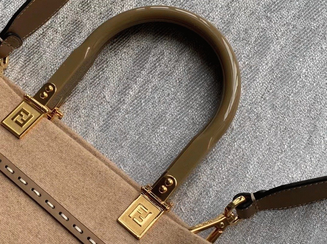 The medium Sunshine Shopper Bag is crafted from brown flannel and features FENDI ROMA leather accents along with sturdy beige plexiglass handles. Inside, it offers a spacious wool-lined compartment adorned with the FF motif, complemented by gold-finish hardware and matching leather edges. The bag includes two handles and a detachable shoulder strap, allowing it to be carried by hand or worn over the shoulder.